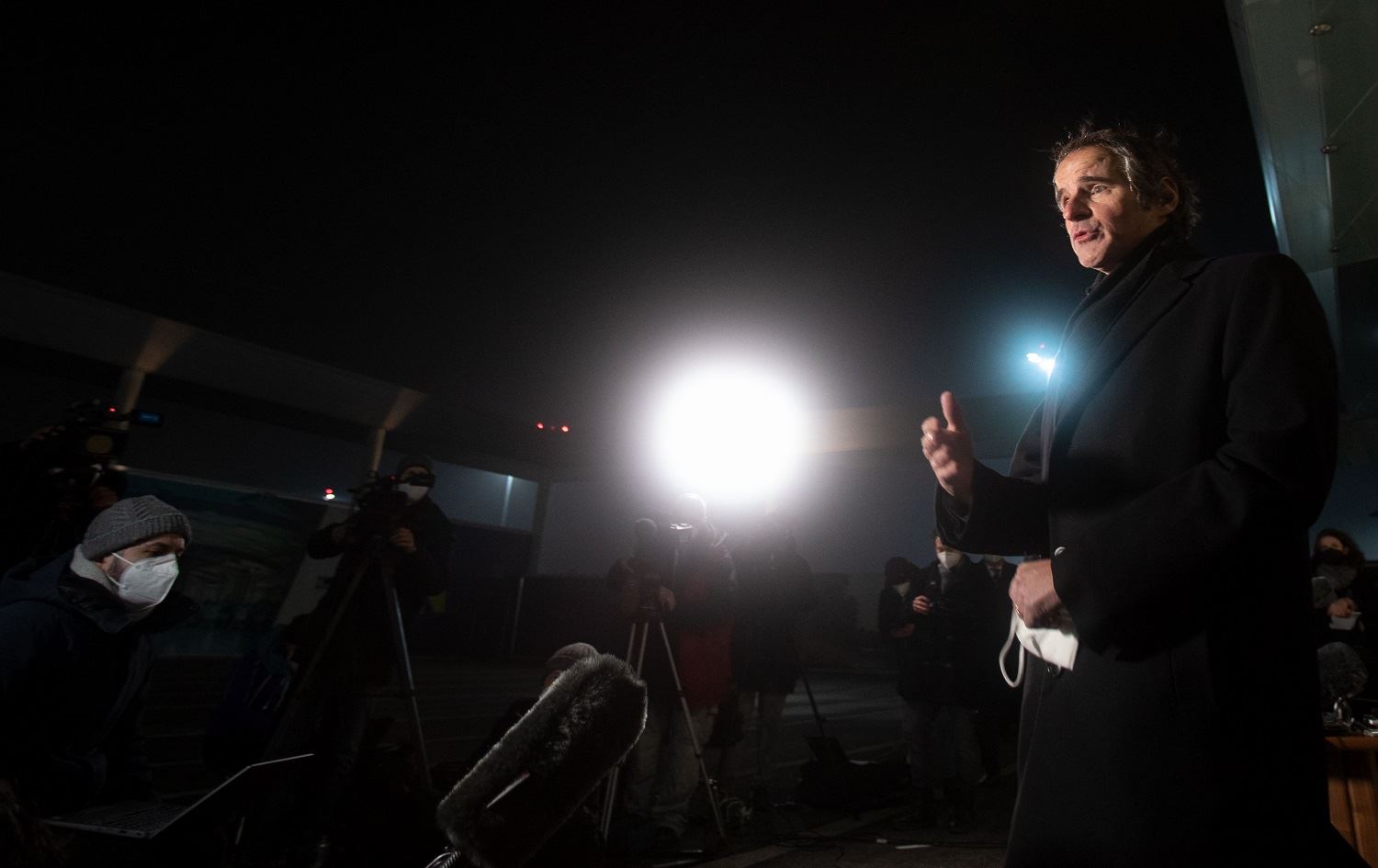 Director General of the International Atomic Energy Agency (IAEA) Rafael Mariano Grossi addresses the media after his arrival at Vienna International Airport on February 21, 2021. Photo: Alex Halada/ AFP