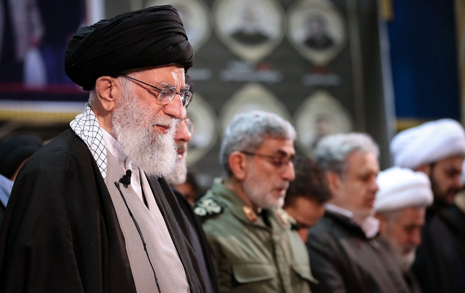 Supreme Leader Ali Khamenei (left) prays over Qasem Soleimani’s body at Tehran University on January 6. New Quds Force commander Esmail Qaani can be seen third from left. Photo: Khamenei.ir