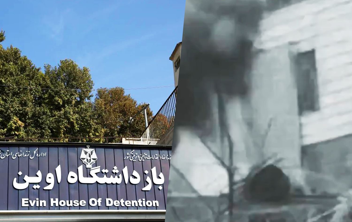 The notorious Evin prison in Tehran (left). Photo: CPJ. An entrance to Evin prison after being hit by an Israeli airstrike on July 23, 2025 (right). Photo: Iranian media
