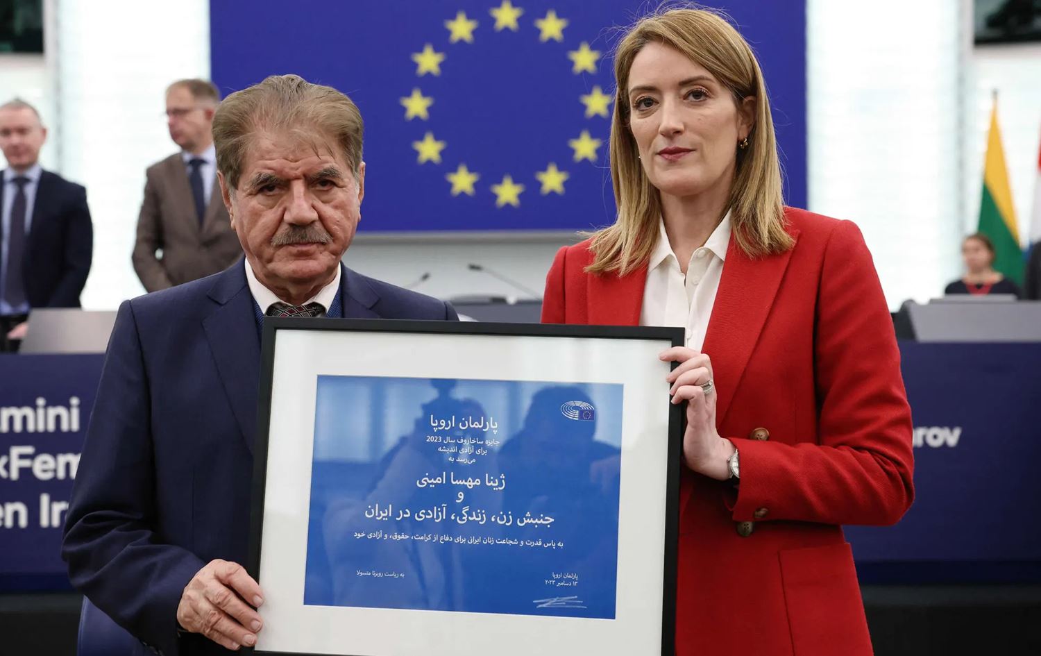 Saleh Nikbakht receiving the Sakharov Prize for Freedom of Thought on behalf of Zhina Amini's family on December 12, 2023 in Strasbourg, France. Photo: AFP