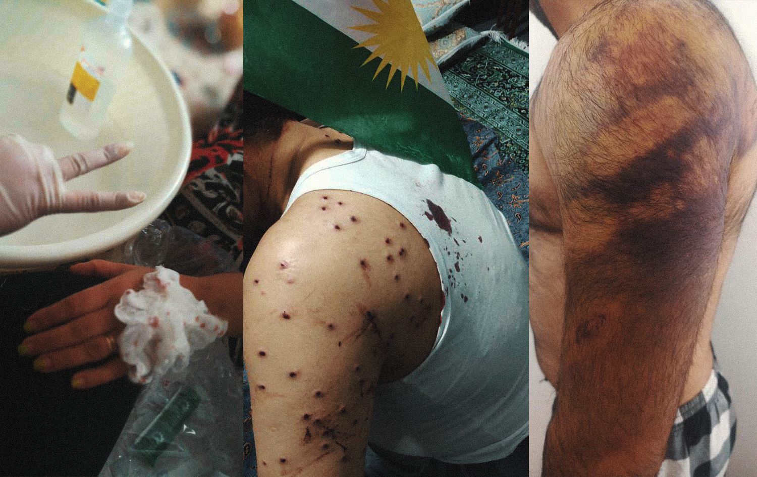 Wounded protesters being treated in the Kurdish city of Kamyaran, western Iran (Rojhelat) in November, 2022. Photo: KURDPA Agency; Graphic: Rudaw