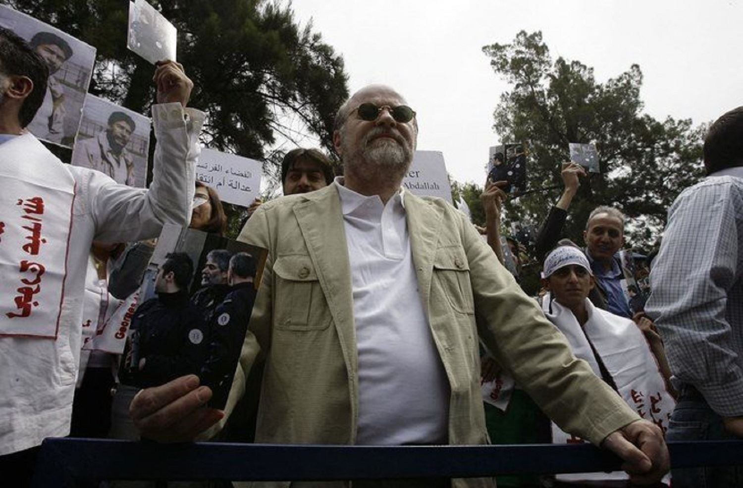 A file photo taken on April 30, 2010, shows Anis Naccache holding a picture of Georges Ibrahim Abdallah during a demonstration outside the French embassy in the capital Beirut. Photo: AFP