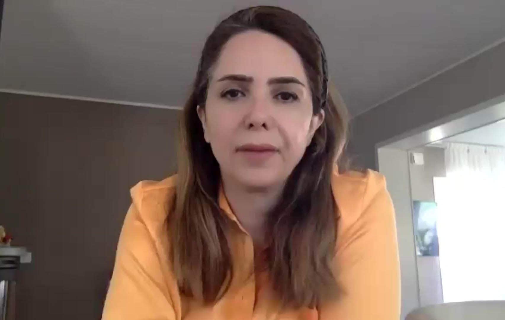 Vida Mehrannia, wife of Ahmedreza Djalali, speaking from Stockholm on May 24, 2022. Photo: AFP/Screenshot