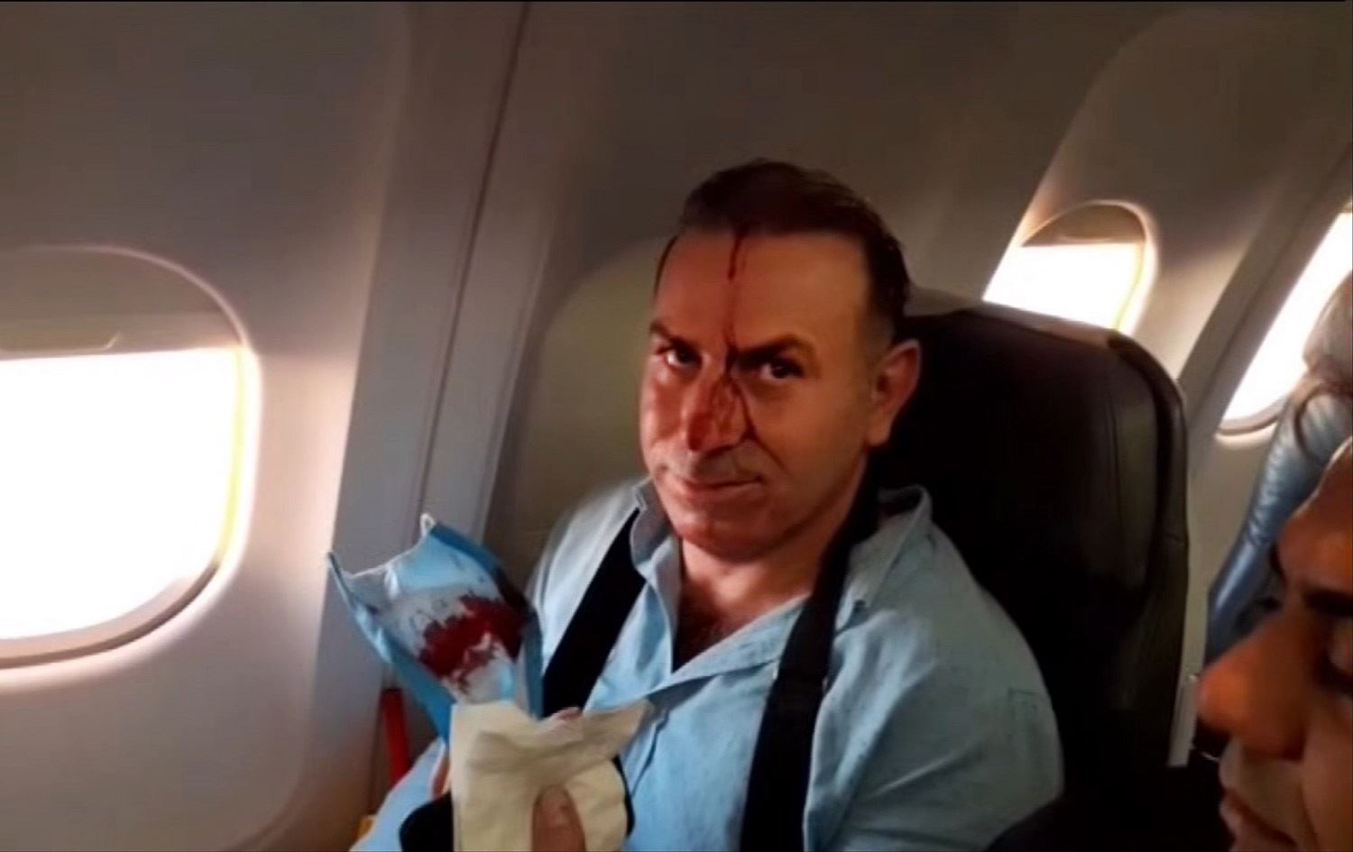 An image grab from a video released by state-run Iran Press news agency on July 24, 2020, reportedly shows a passenger with blood dripping on his face, on an Iranian passenger plane after it was intercepted by a US F-15 while flying over Syria. Photo: handout/Iran Press/AFP