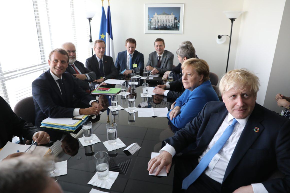 French President Emmanuel Macron (left) meets with German Chancellor Angela Merkel (second to right) and British Prime Minister Boris Johnson (right) at the United Nations headquarters in New York on September 23, 2019. Photo: Ludovic Manin / AFP