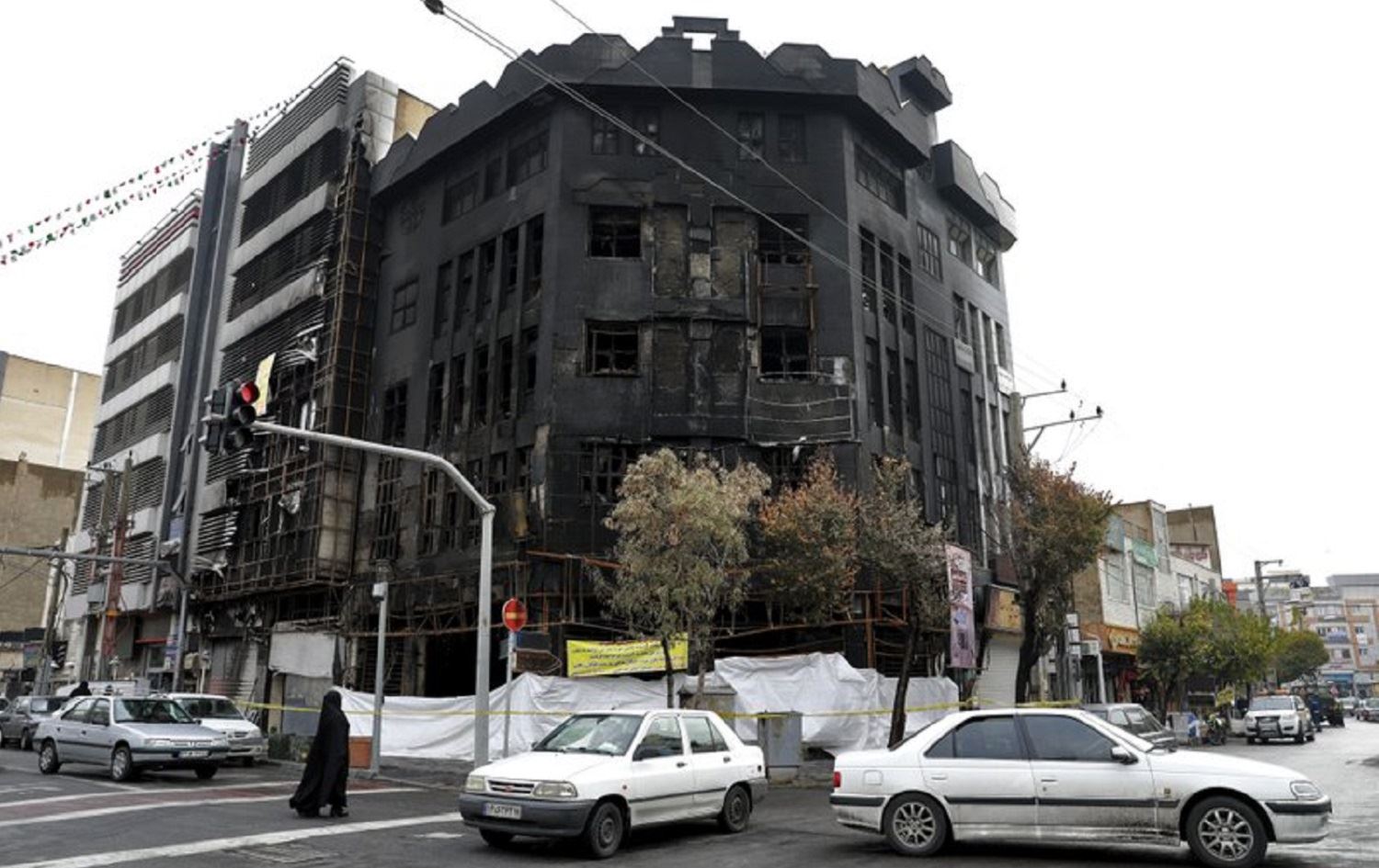 Traffic passes a building set ablaze during protests over government-set gasoline prices rises in Tehran, Iran on November 20, 2019. File photo: AP / Ebrahim Noroozi