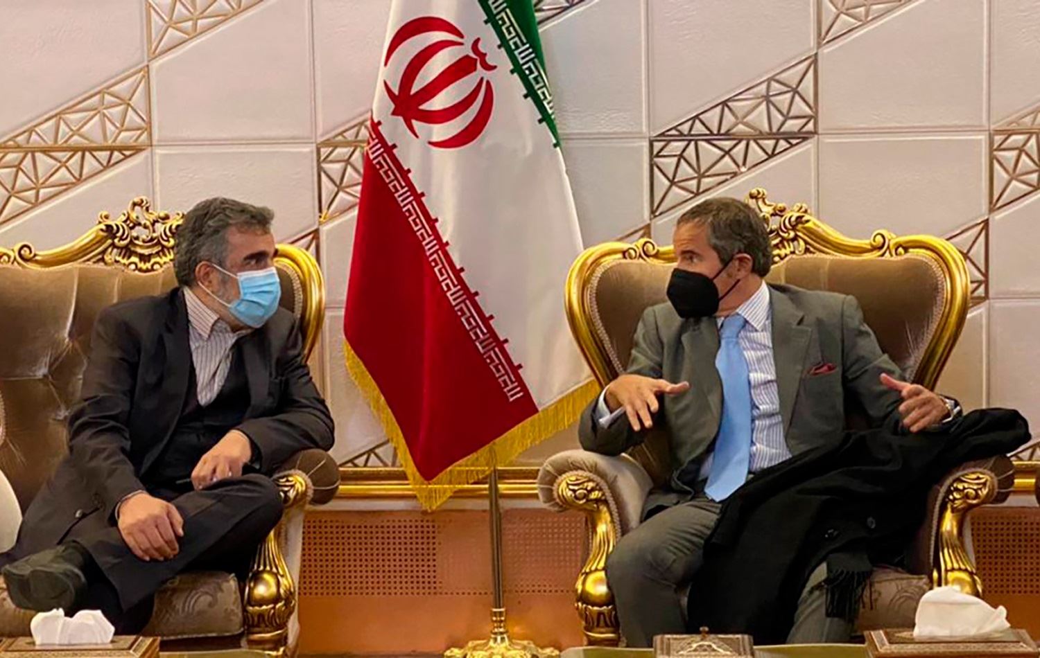 A handout from the Atomic Energy Organization of Iran shows Behrouz Kamalvandi (L) and International Atomic Energy Agency head Rafael Grossi in Tehran, Iran on November 22, 2021. Photo: Atomic Energy Organization of Iran / AFP
