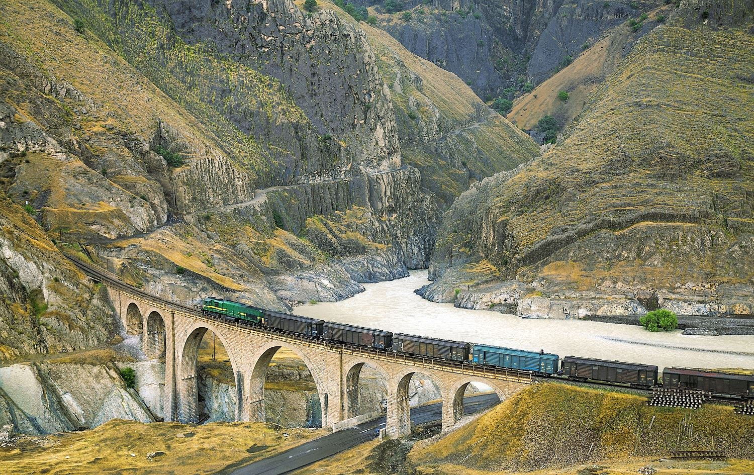 A freight train crosses the Absirom Bridge, Lorestan, on the South Line of the Trans-Iranian Railway. Photo: Hossein Javadi/UNESCO