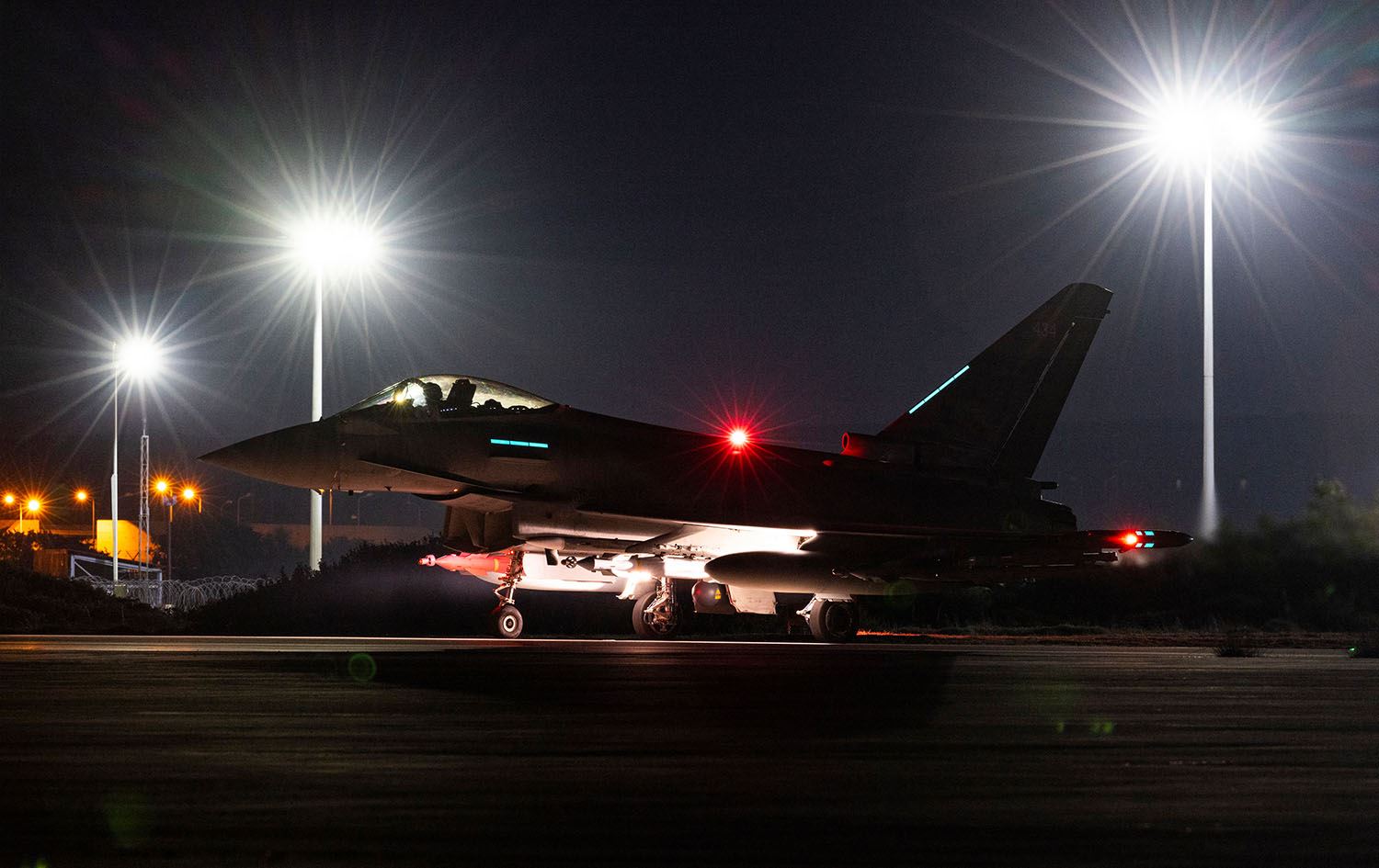 A handout picture released by the British Ministry of Defence (MOD) on February 24, 2024 shows one of four RAF Typhoon aircraft at RAF Akrotiri in Cyprus, involved in striking military targets in Yemen on February 24, 2024. Photo: Tim Laurence/MOD/AFP