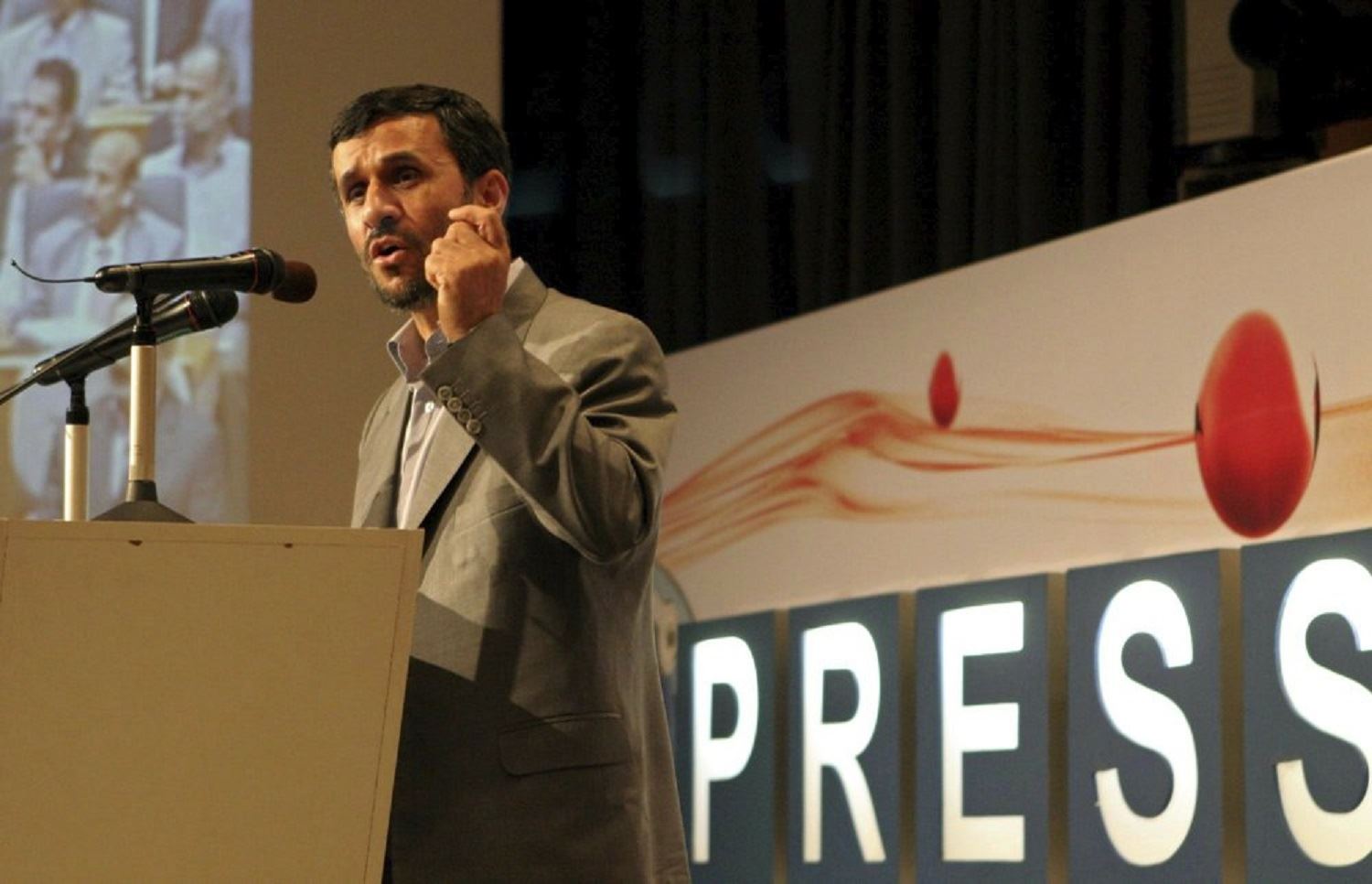 In this July 2, 2007, file photo, the then President Mahmoud Ahmadinejad delivers his speech during inauguration ceremony for Iran's first English-language channel, Press TV, as its logo is seen in background, in Tehran, Iran. Photo: Vahid Salemi/ AP
