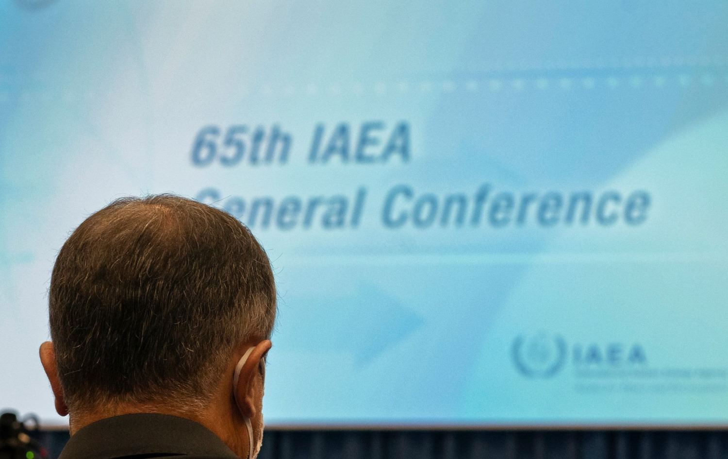 Head of Atomic Energy Organization of Iran (AEOI) Mohammad Eslami is pictured from behind during the annual meeting of all the IAEA member states in the agency’s headquarters in Vienna on September 20, 2021. Photo: JOE KLAMAR / AFP