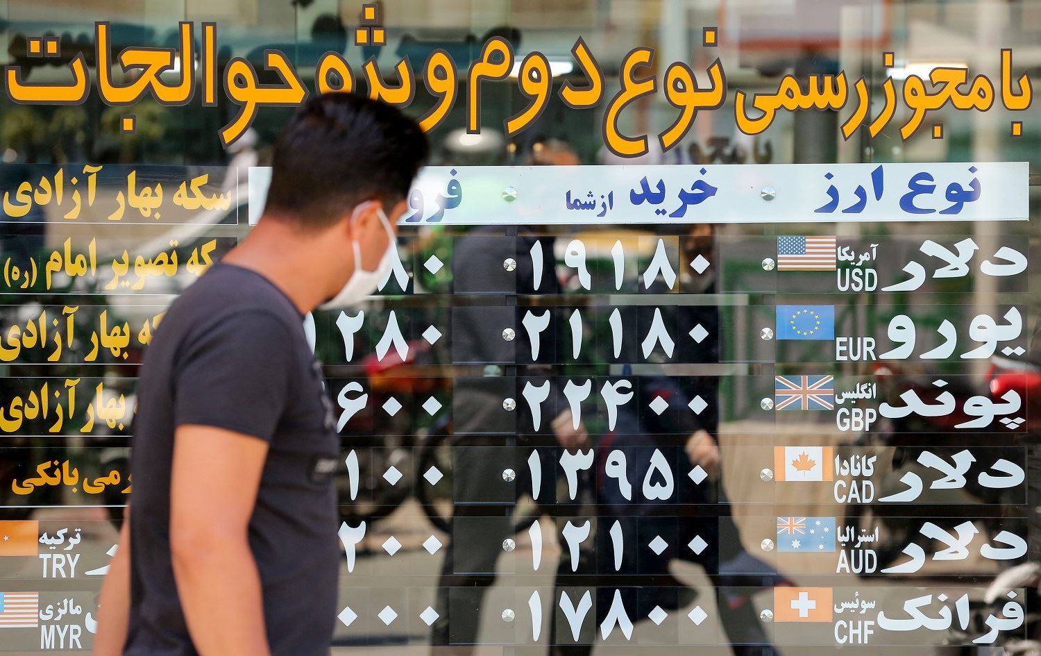 A man wearing a protective mask checks currency exchange rates in the Iranian capital Tehran on June 22, 2020. Photo: Atta Kenare / AFP