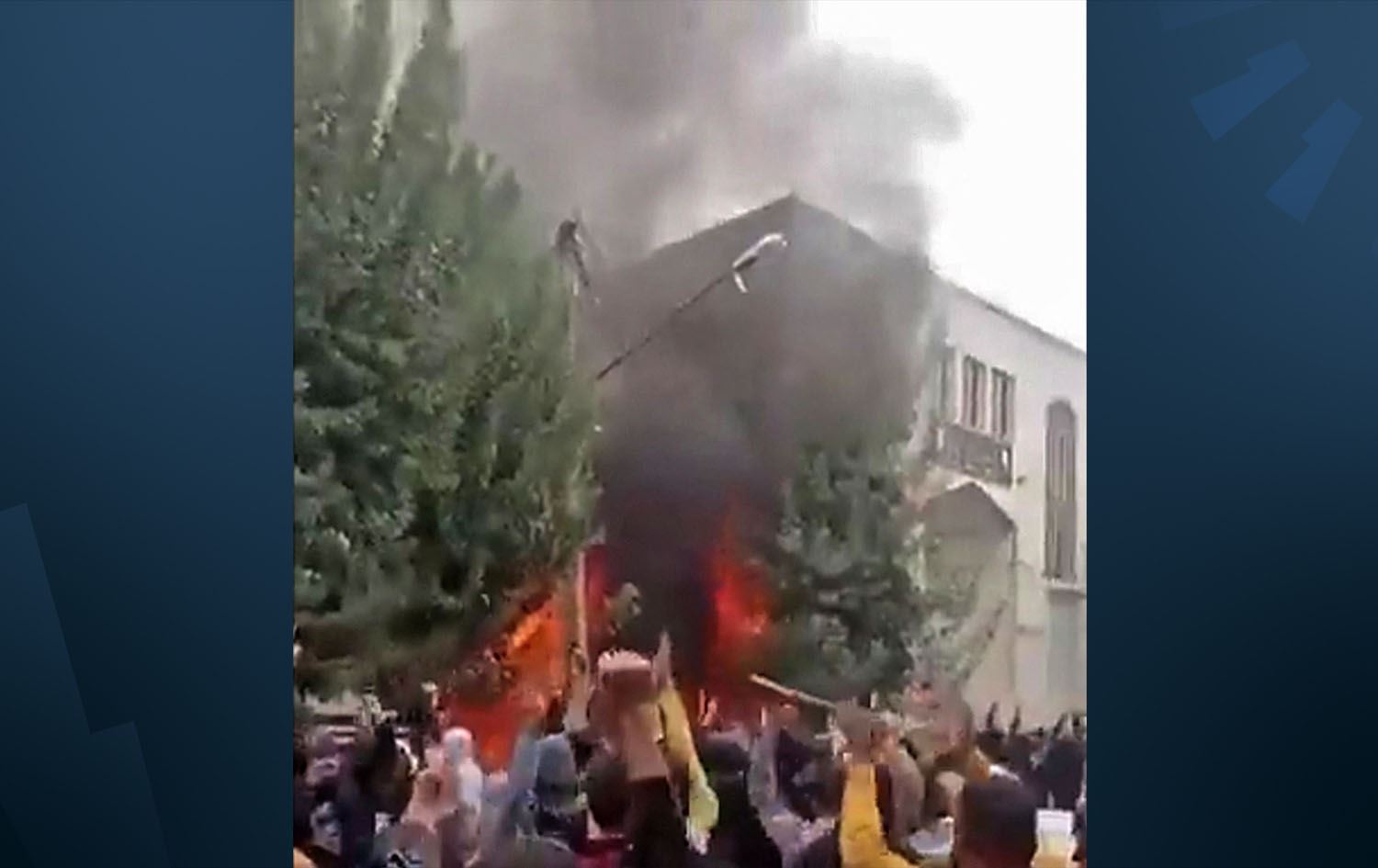 This image grab from a UGC video released on October 27, 2022, shows a fire burning at the office of the Governor of Mahabad, West Azerbaijan province of Iran.