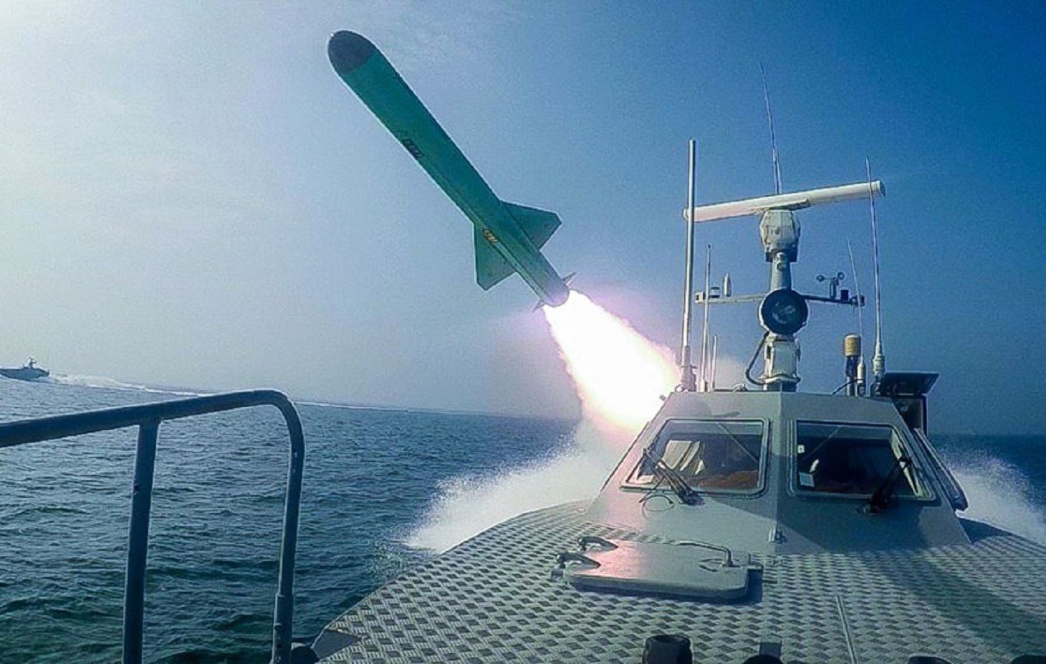 In this photo released Tuesday, July 28, 2020, by Sepahnews, a Revolutionary Guard's speed boat fires a missile during a military exercise. Iranian commandos also fast-roped down from a helicopter onto a replica of an aircraft carrier in the exercise called "Great Prophet 14." The drill appears aimed at threatening the U.S. amid tensions between Tehran and Washington. Photo: Sepahnews via AP