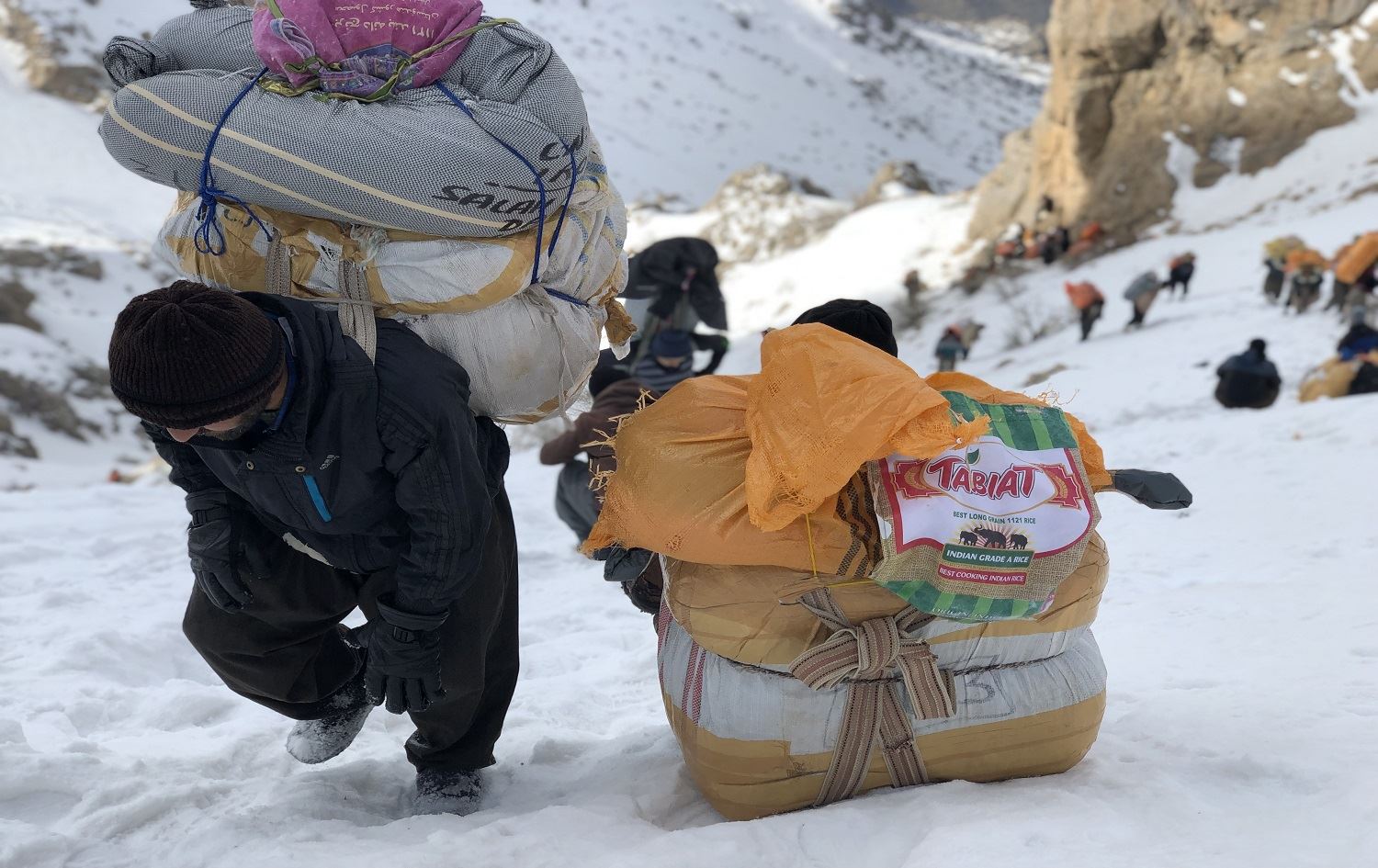 Kolbars carrying large loads on the slope of Tata Mountain, Hawraman on February 2019. Photo: Fazel Hawramy/Rudaw