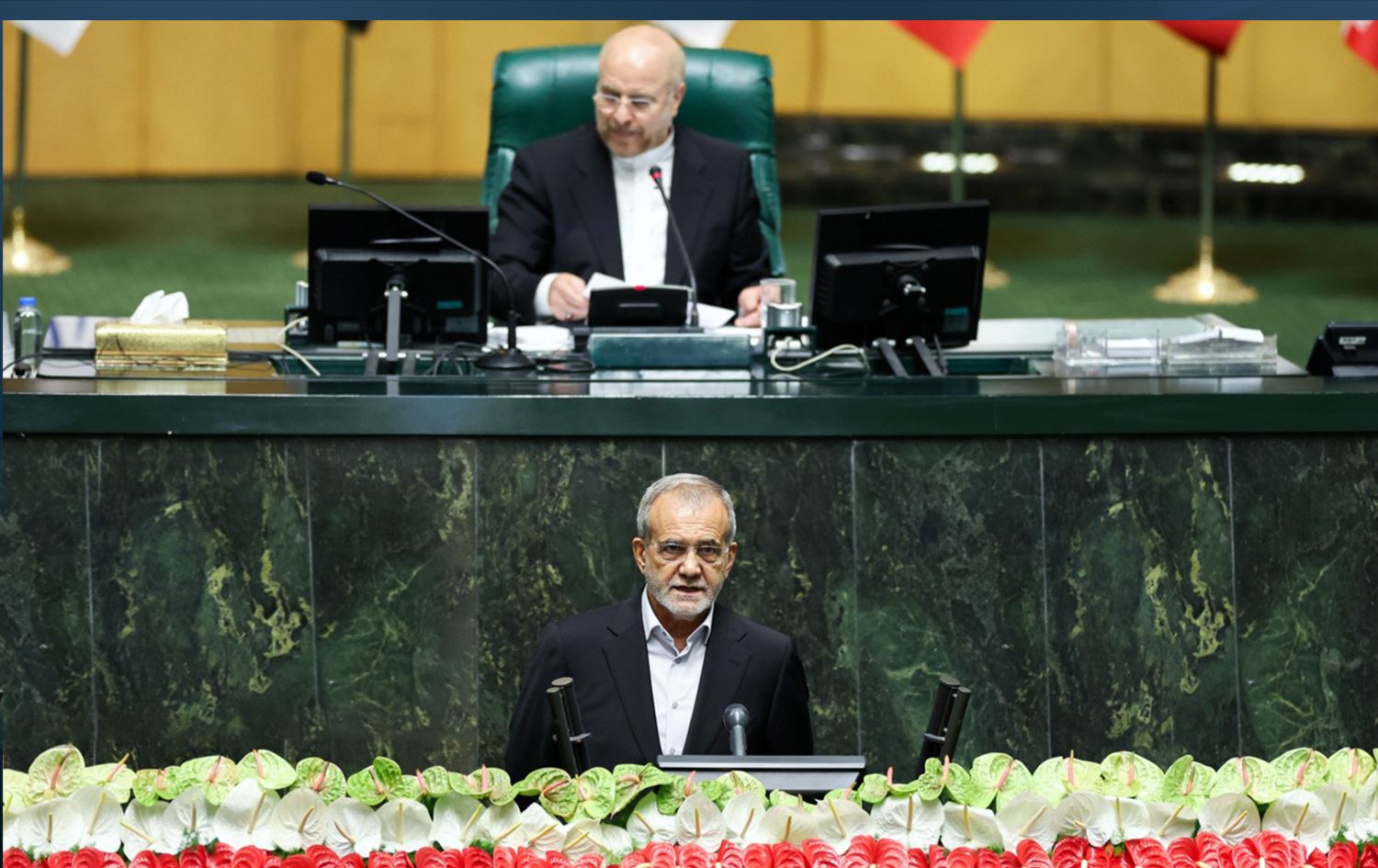Masoud Pezeshkian (standing down) being sworn in at the parliament on July 30, 2024. Photo: IRNA