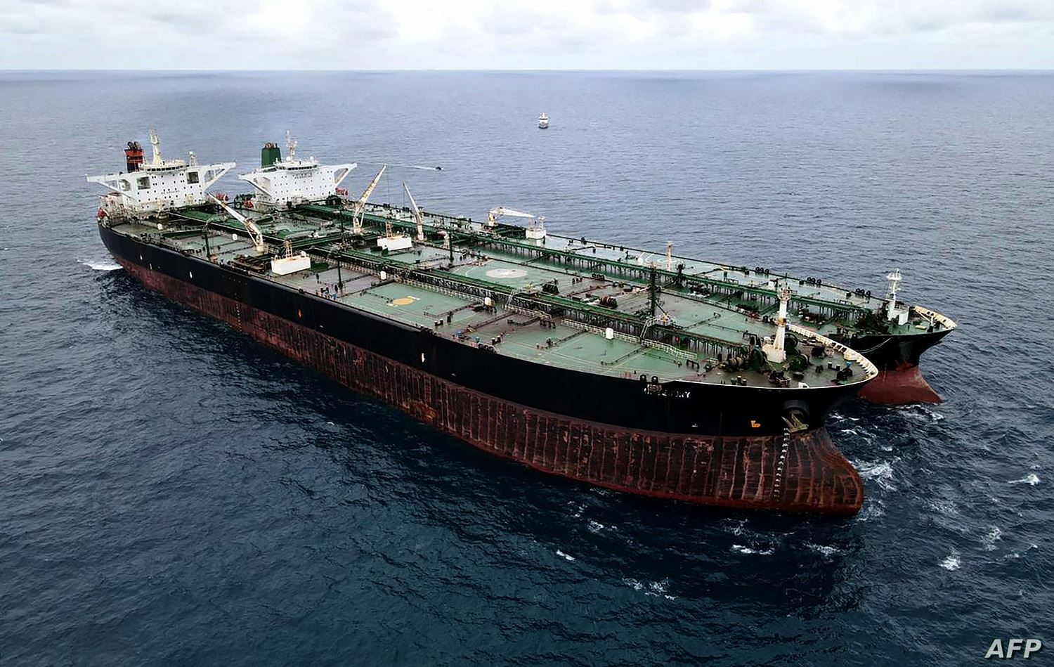 Aerial photo taken on January 24, 2021 shows a seized Iranian tanker and Panamanian vessel suspected of illegally transferring oil in Indonesian waters. Photo: AFP