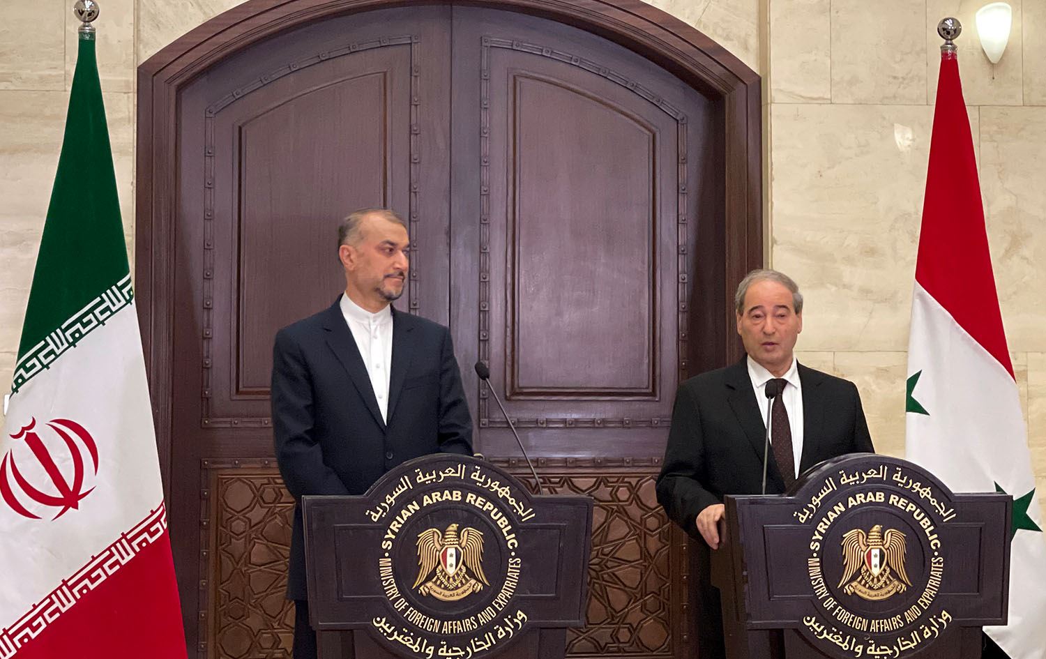 Syrian Foreign Minister Faisal Mekdad (R) speaks during a press conference with his Iranian counterpart Hossein Amir-Abdollahian in the capital Damascus, on August 30, 2023. Photo: Maher Al Mounes/AFP