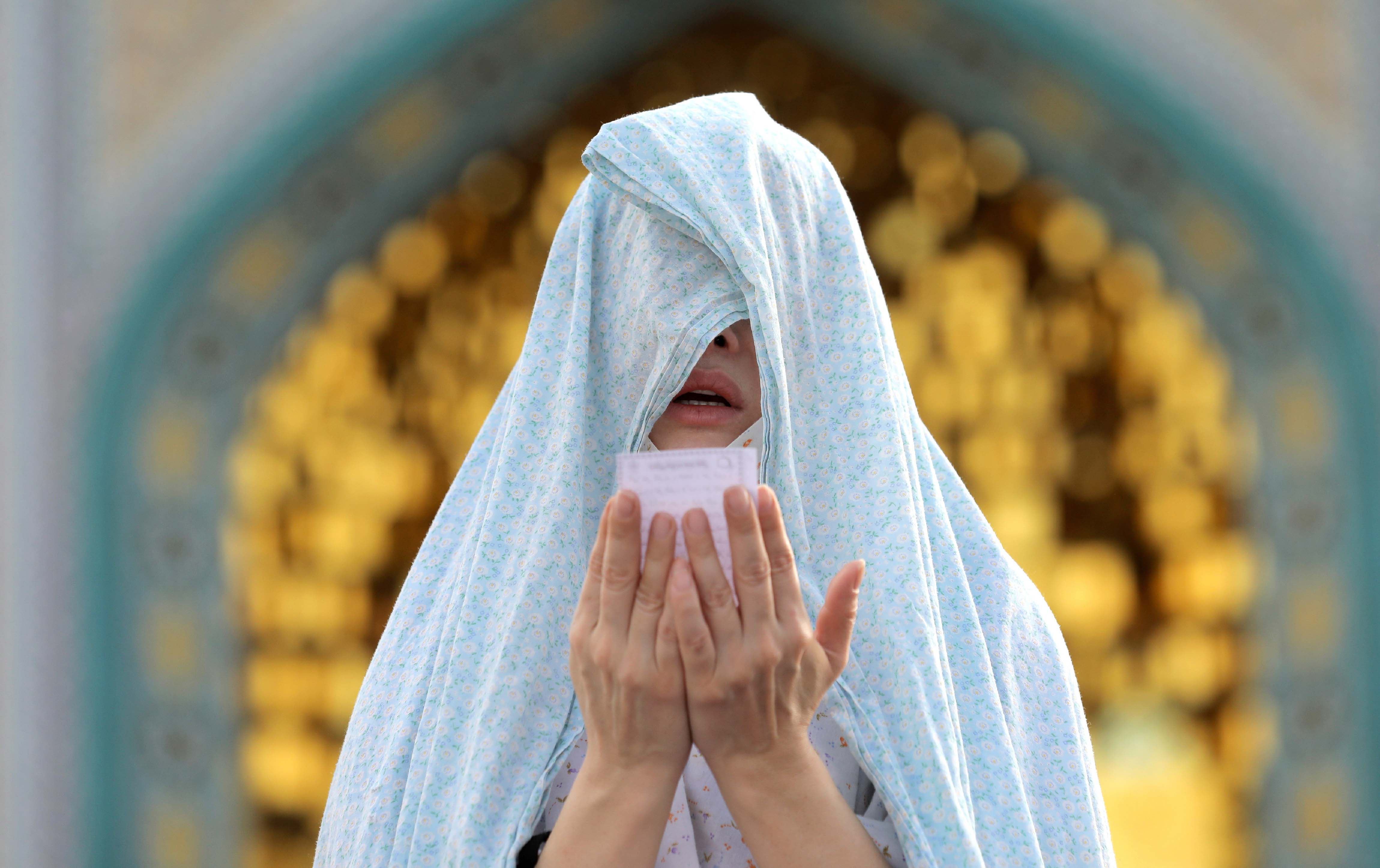 A worshipper offers Eid al-Fitr prayers marking the end of the Islamic fasting month of Ramadan, outside a shrine in Tehran, Iran, Sunday, May 24, 2020. Photo: Ebrahim Noroozi / AP