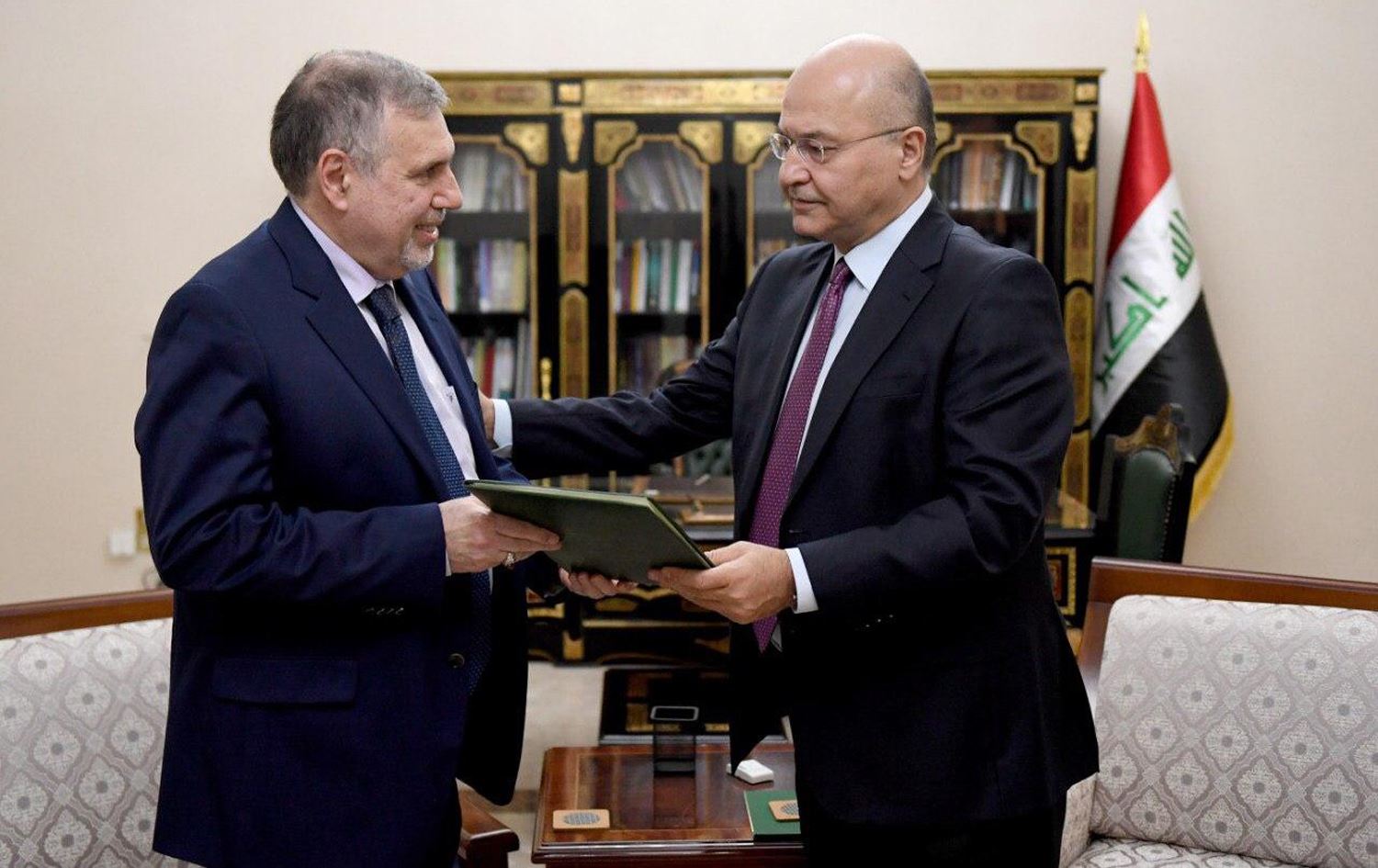 Iraqi President Barham Salih hands Mohammad Tawfiq Allawi an official letter granting the authority to form a new cabinet on February 1, 2020. (Photo via Iraqi state media)