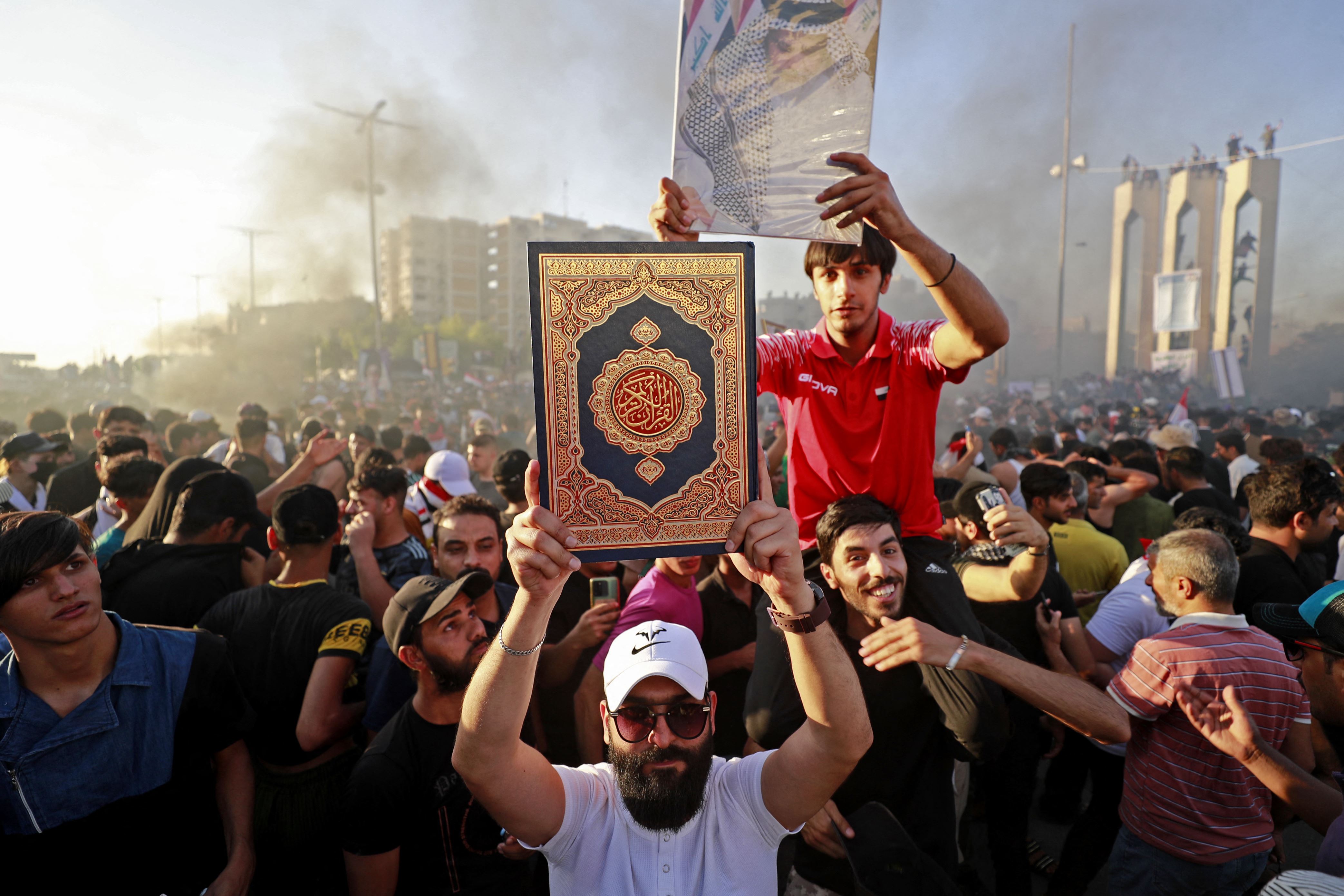 A supporter of Iraq's Sadrist movement holds up the Quran outside the Swedish embassy in Baghdad on June 30, 2023. Photo: AFP