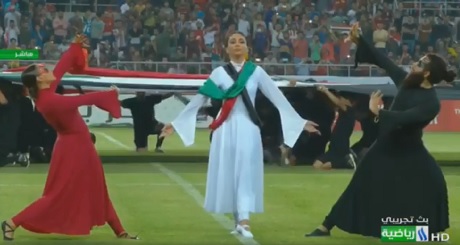 Three dancers take part in the opening ceremony of the West Asia Football Federation (WAFF) championship match between Iraq and Lebanon at Karbala International Stadium, Iraq, July 30, 2019. Photo: Iraqi Football Association / Facebook