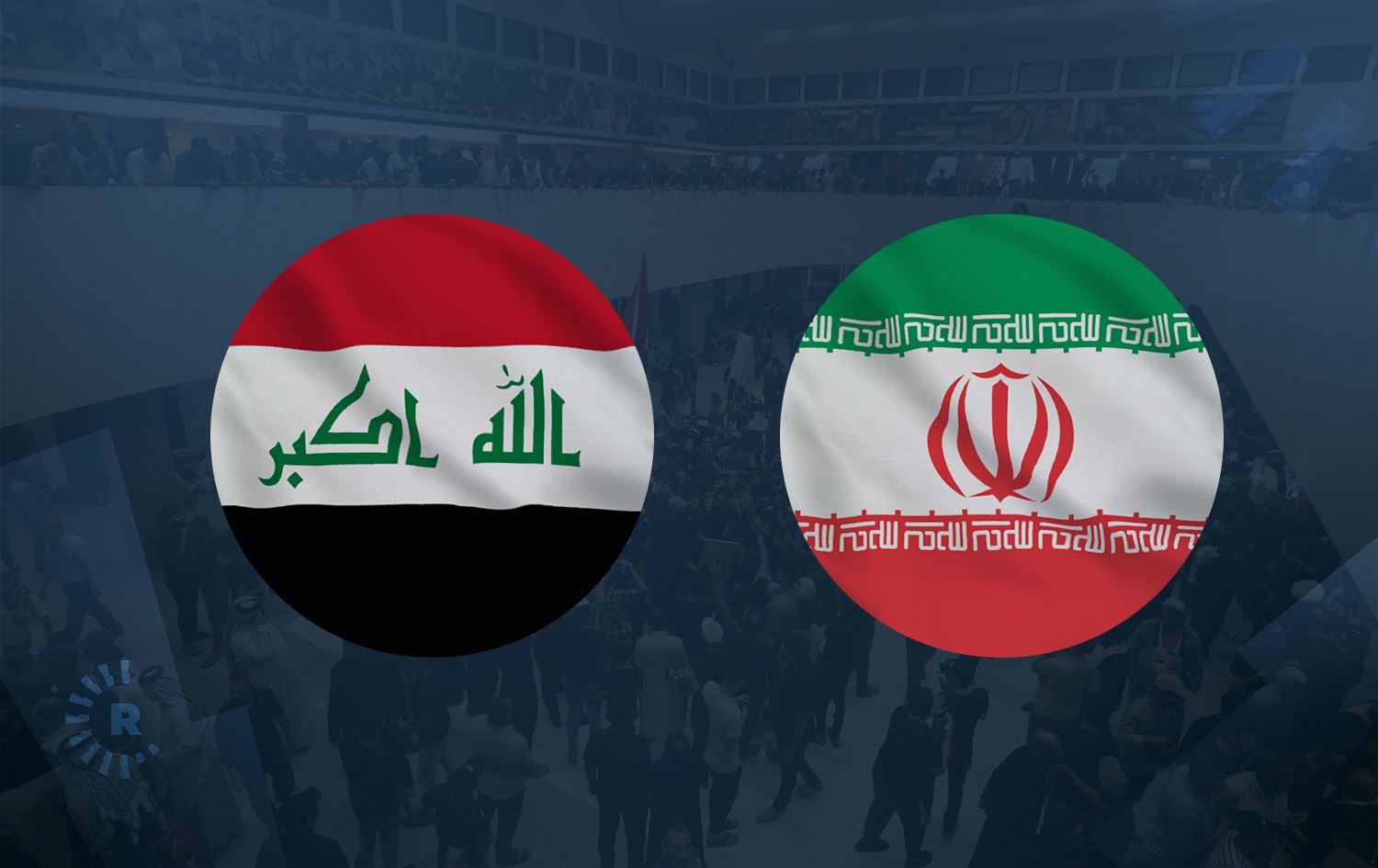 Iraq (left) and Iran flags over a picture (background) showing the Iraqi parliament packed with supporters of Shiite cleric Muqtada al-Sadr on July 31, 2022. Photo: Sabah Arar/AFP. Graphic: Rudaw