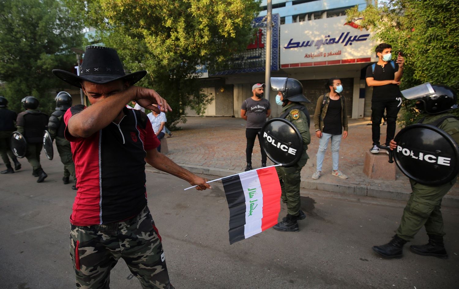 An Iraqi demonstrator holds a national flag as security forces deploy in the capital Baghdad's Al-Firdous Square on October 1, 2020. Photo: Ahmad al-Rubaye / AFP