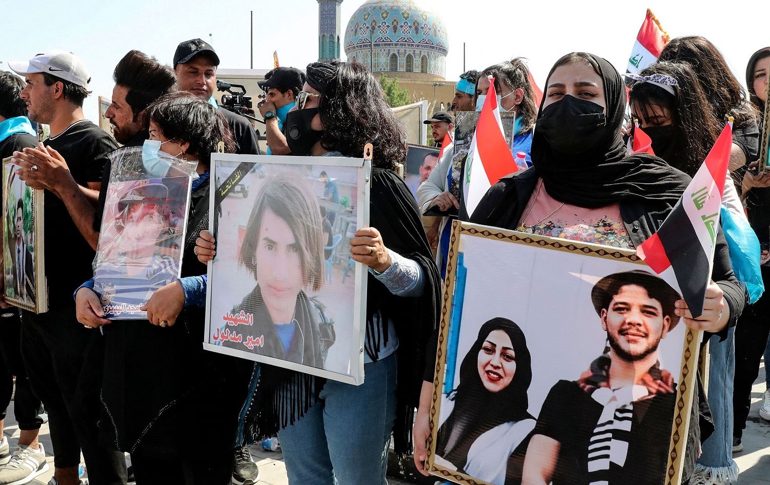 Iraqis hold pictures of demonstrators killed during the Tishreen protests as they rally in Baghdad on October 1, 2021. Photo: Sabah Arar/AFP