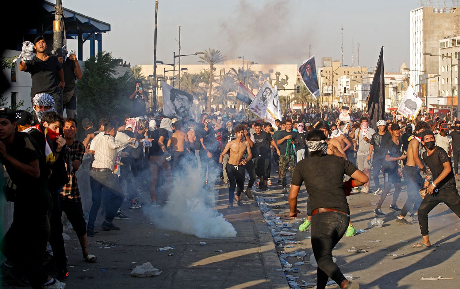 Iraqi protesters react to tear gas fired by security forces amid clashes at al-Jumhuriya bridge leading to the capital Baghdad's high-security Green Zone on October 1, 2022. Photo: Ahmad al-Rubaye/AFP