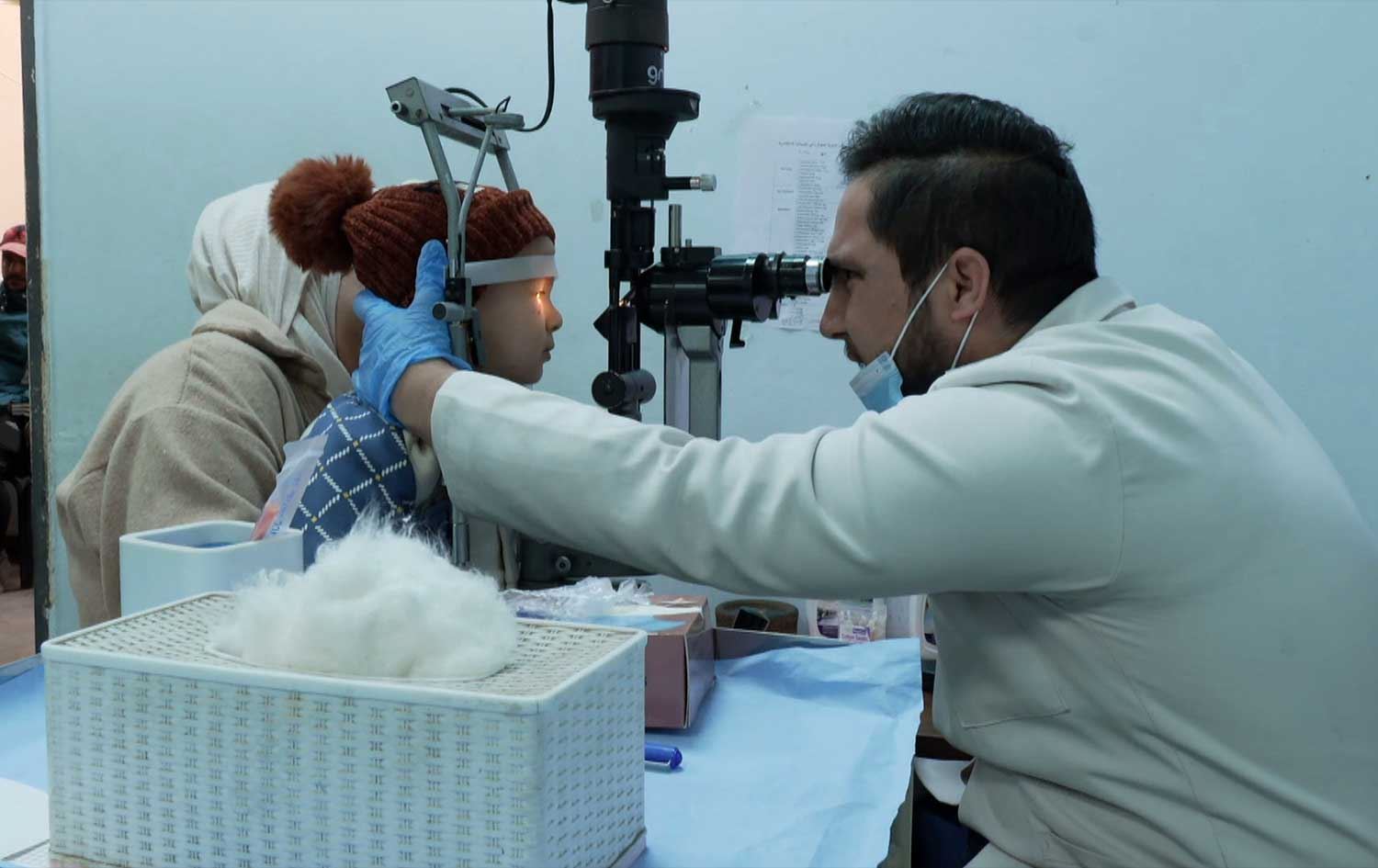 Dr. Hussein Karim, a specialist at Baghdad’s Ibn al-Haytham eye hospital, examines a child’s injured eye on January 1, 2026. Photo: screengrab/Rudaw