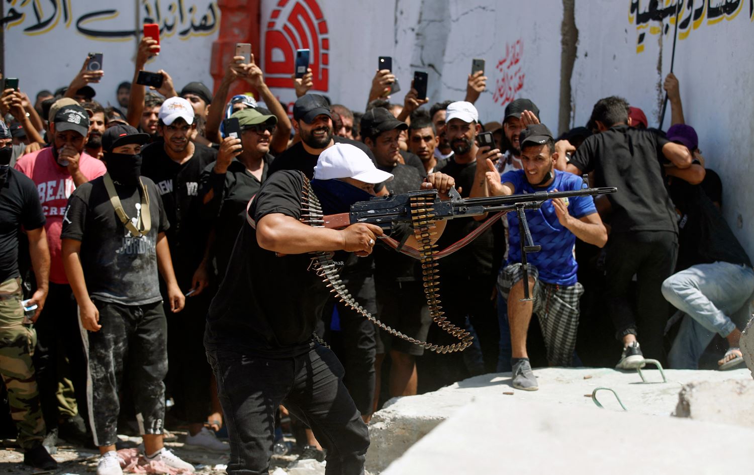 Armed members of Saraya al-Salam take aim during clashes with Iran-backed militias in Baghdad's Green Zone on August 30, 2022. Photo: Ahmad al-Rubaye/AFP