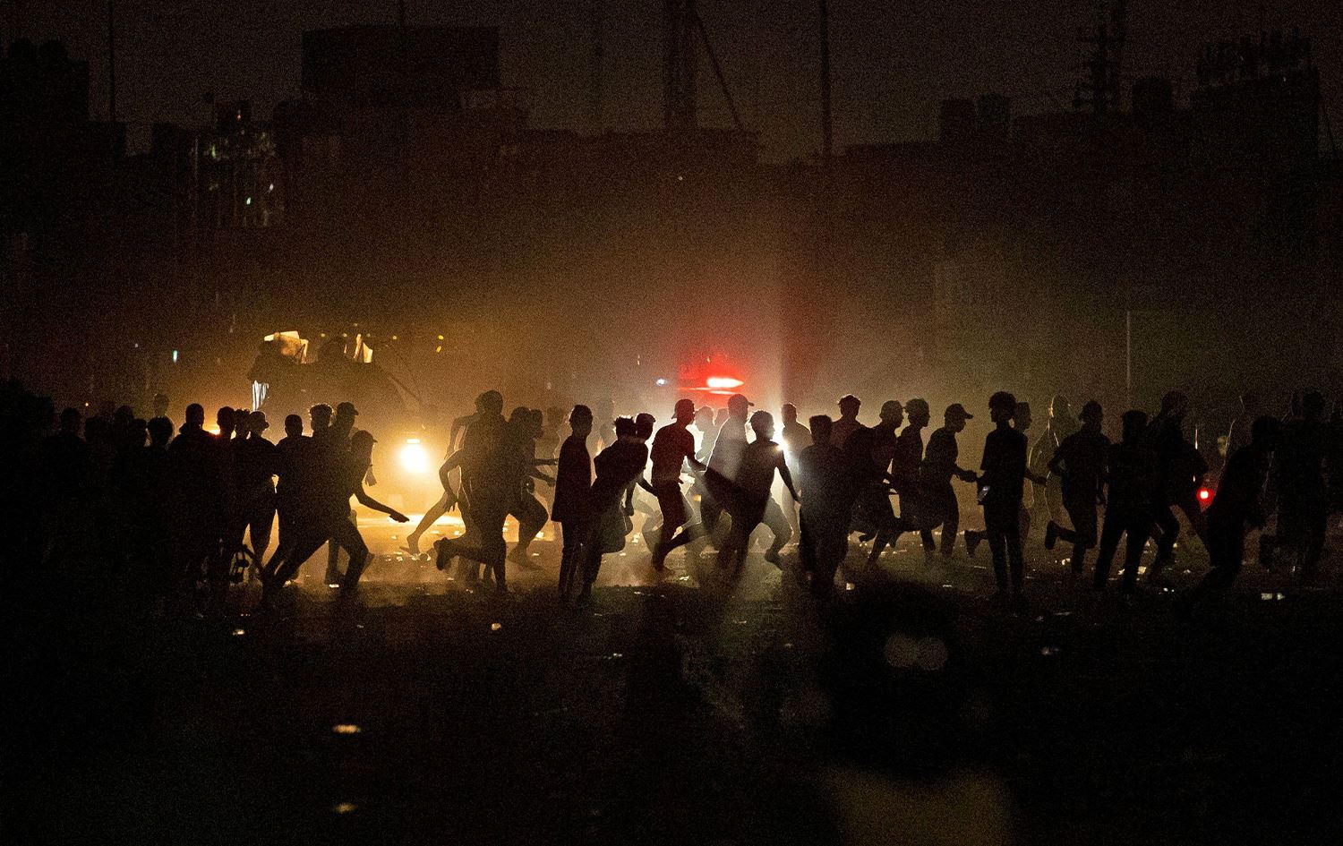 Iraqi protesters sprint away as security forces deploy during a rally to mark three years since nationwide demonstrations erupted against endemic corruption, in the southern city of Basra, on October 1, 2022. Photo: Hussein Faleh/AFP