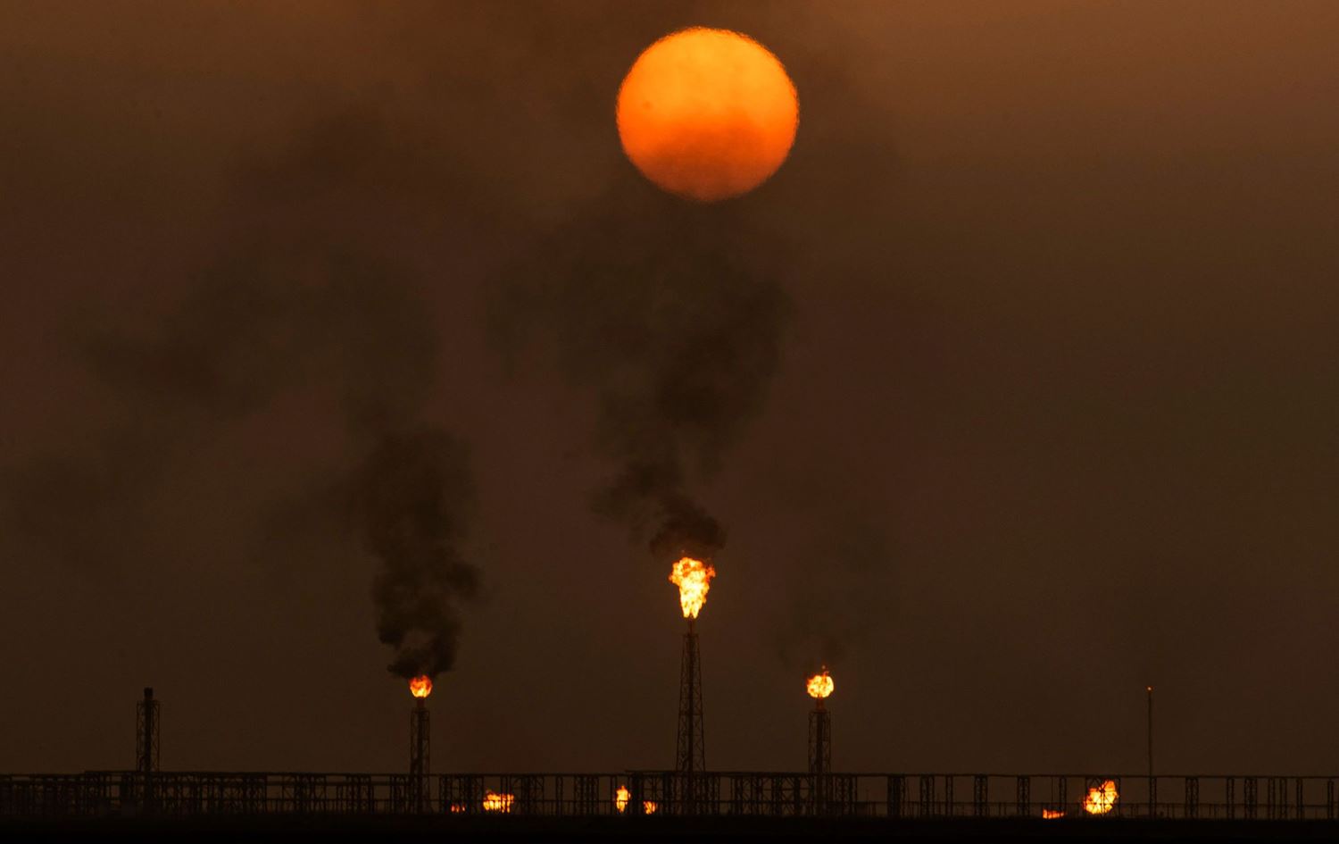 The sun sets as flare stacks burn off excess gas at the Mushrif site inside the Zubair oil and gas field, north of the southern Iraqi province of Basra, on July 13, 2022. Photo: Hussein Faleh/AFP