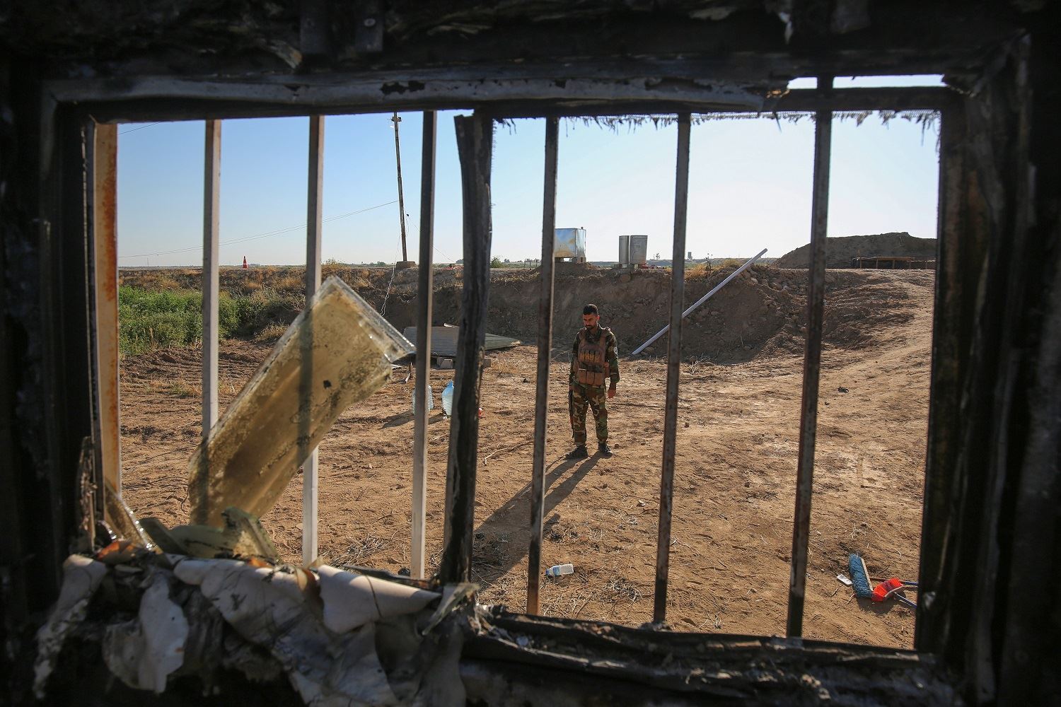 An Iraqi fighter with the Hashed al-Shaabi (Popular Mobilisation Forces) inspects the site of the Islamic State (IS) group attack, a day earlier, on a unit of the paramilitary force in Mukaishefah on May 3, 2020. Photo: Ahmad Al-Rubaye/ AFP