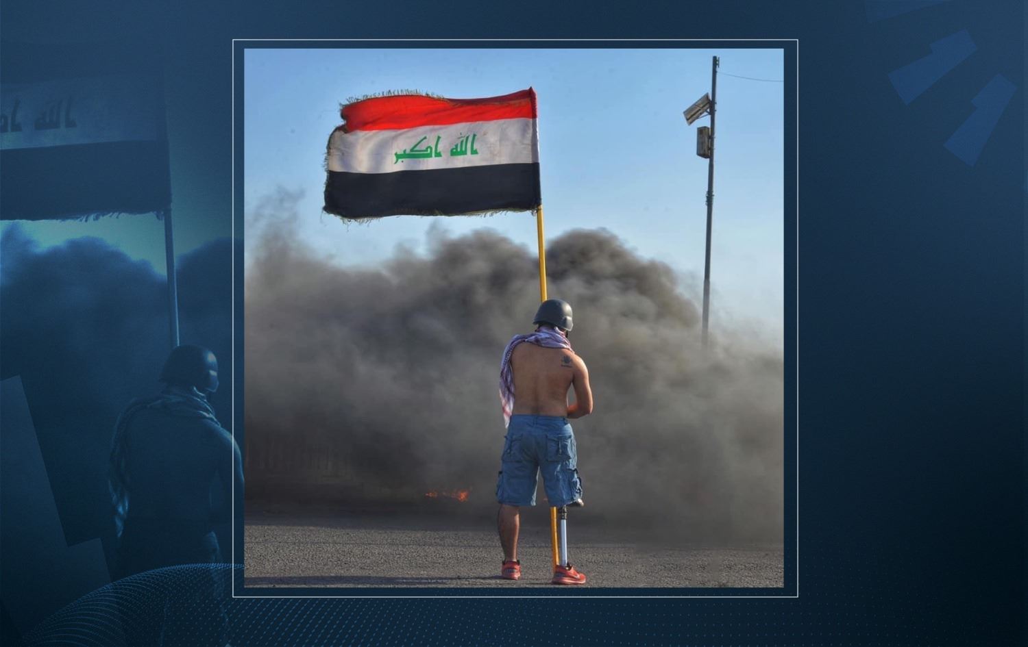 Hassan Maher holds up an Iraqi flag at an anti-government protest in Nasiriyah. Photo: courtesy of Hassan Maher