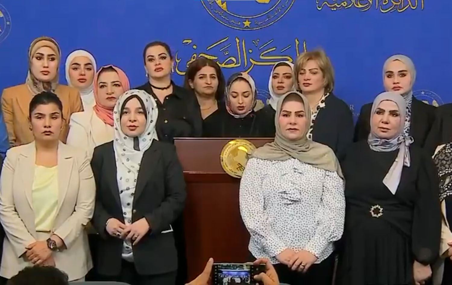 Iraqi women MPs reading a statement in Baghdad on August 3, 2024. Photo: Screengrab/@NoorNafeaAli ion X.