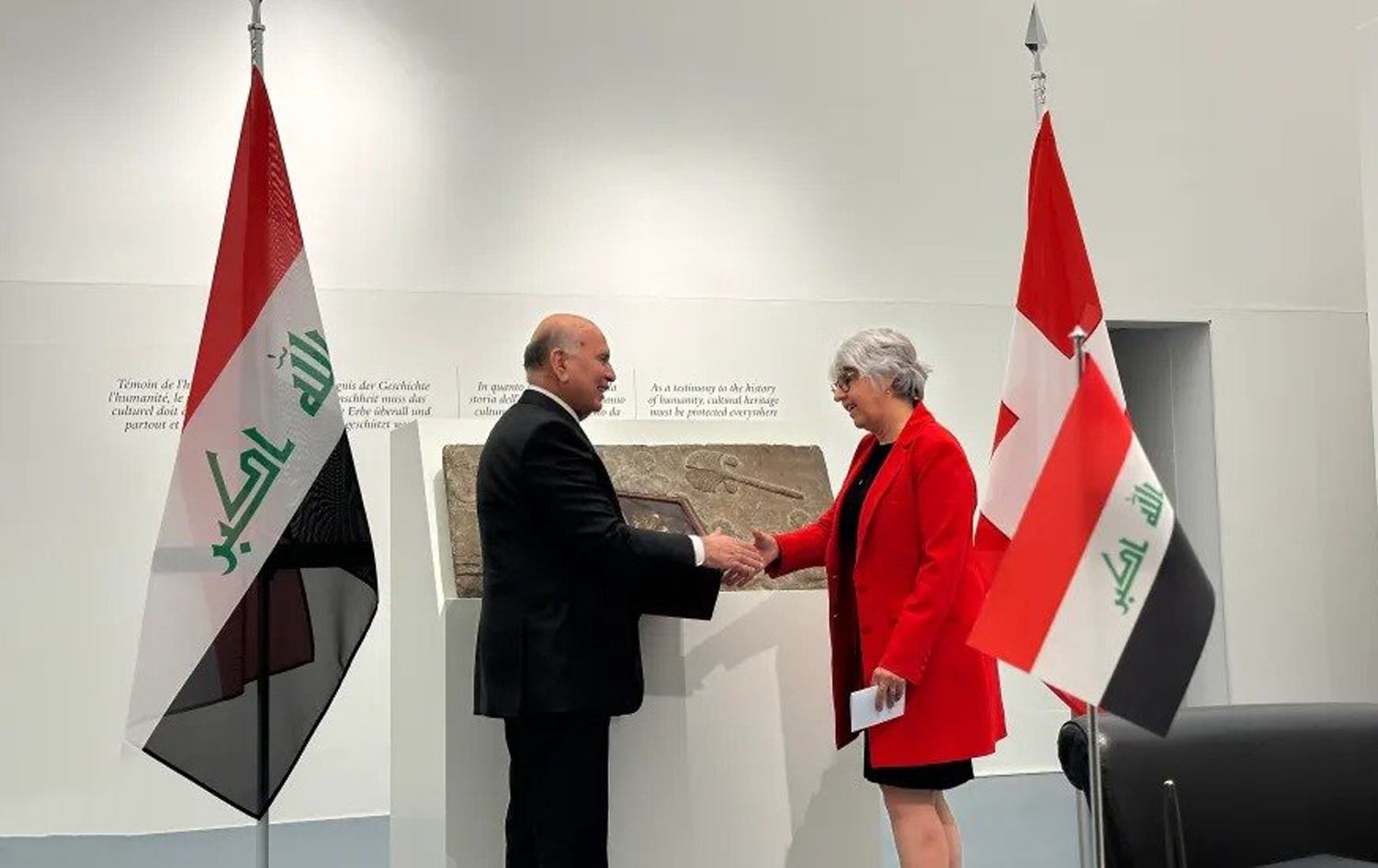 Iraqi Foreign Minister Fuad Hussein (left) and Elisabeth Baume-Schneider, head of Switzerland’s Department of Home Affairs (right) shake hands during a ceremony to return Assyrian artifacts on May 24, 2024. Photo: Iraqi state media