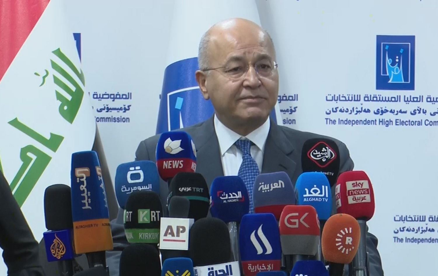 Iraqi President Barham Salih speaks to reporters at the electoral commission office in Baghdad on October 3, 2021. Photo: Rudaw