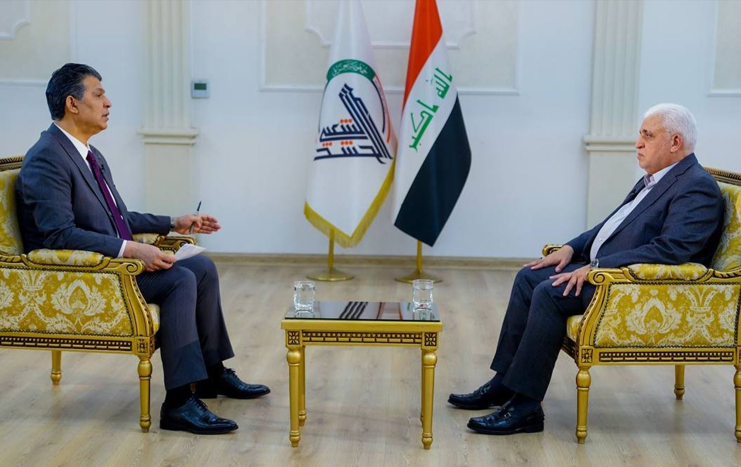 Falih al-Fayyadh (right), the head of Iraq's Popular Mobilization Forces, in an interview with Iraqi state TV on December 2, 2024. Photo: INA