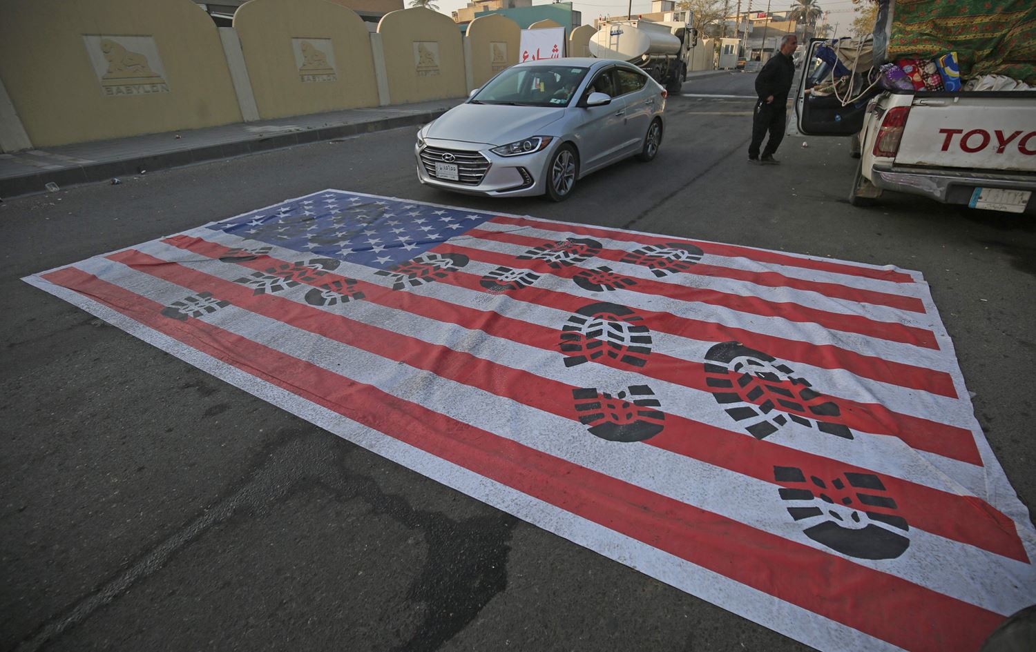 A mock US flag is laid on the ground for cars to drive on in the Iraqi capital Baghdad on January 3, 2020. Photo: Ahmed al-Rubaye/AFP