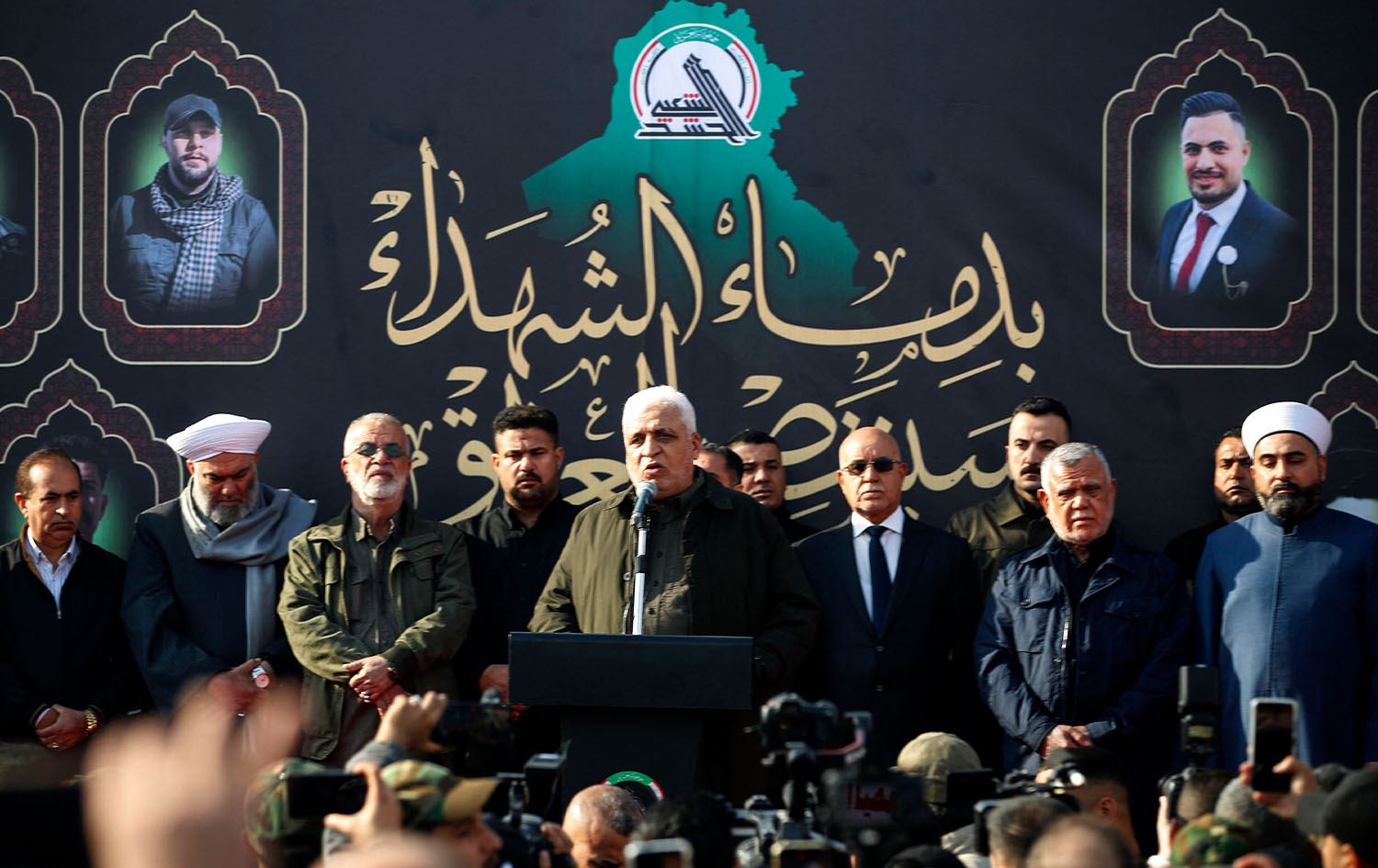 Falih al-Fayyadh (center), head of Iraq's Iran-aligned Popular Mobilization Forces (PMF, or Hashd al-Shaabi), speaks during the funeral of people killed the previous day in US strikes in western Iraq, in Baghdad on January 4, 2024. Photo: Ahmad al-Rubaye/AFP