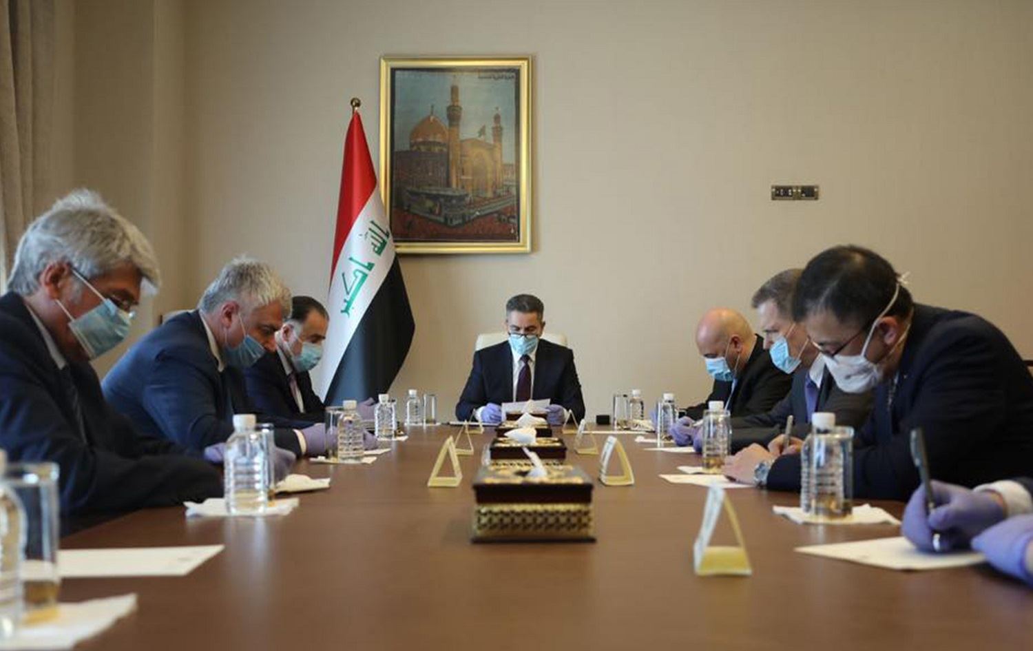 Prime Minister-designate Adnan al-Zurfi (centre) meets with the ambassadors of the P5 countries of the United Nations Security Council in Baghdad on March 25, 2020. Photo: Iraqi Prime Minister's Office / AFP