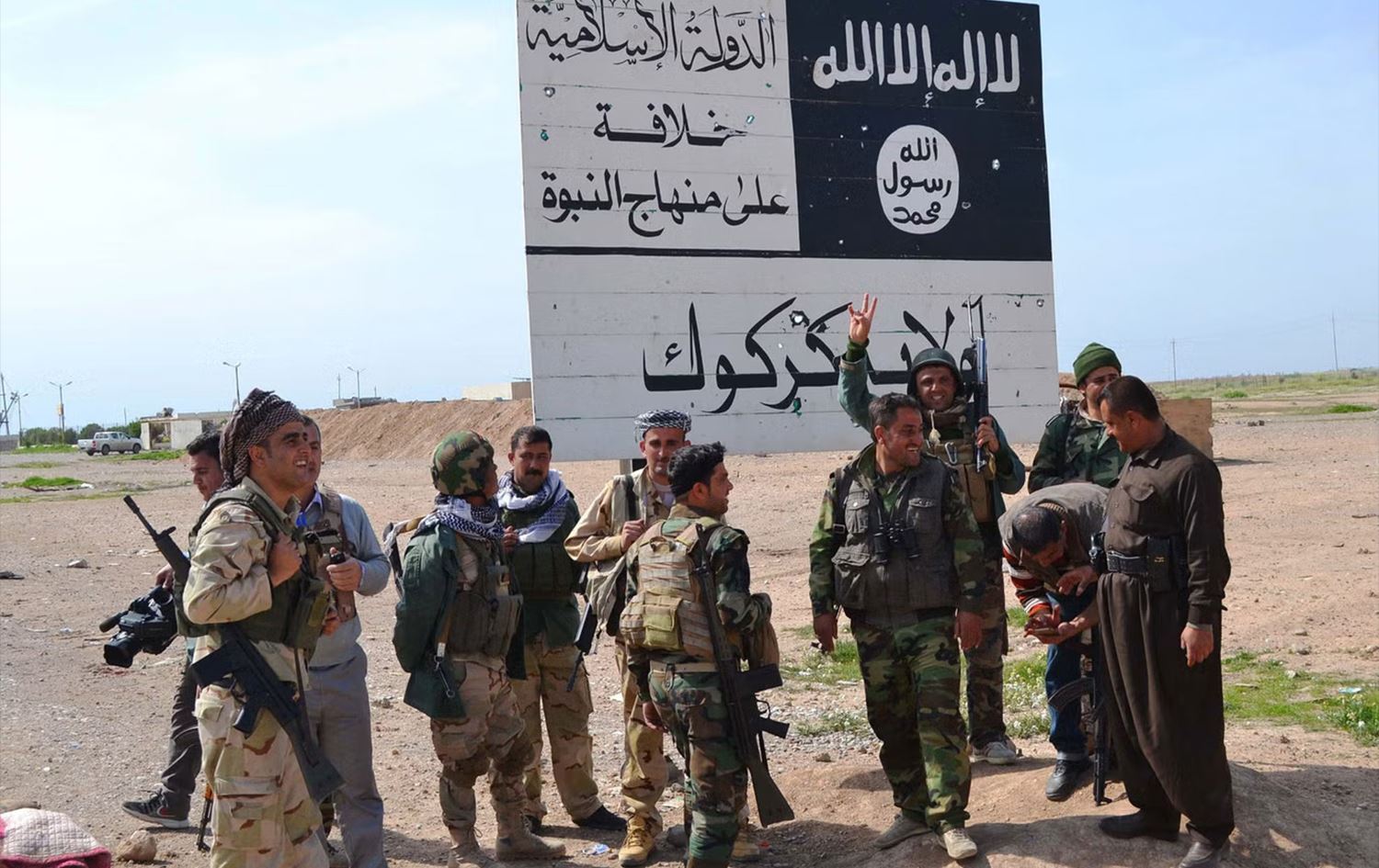 Kurdish Peshmerga fighters next to an ISIS sign at the entrance to the northern Iraqi town of Hawija, south of Kirkuk, in March 2015. Photo: AFP