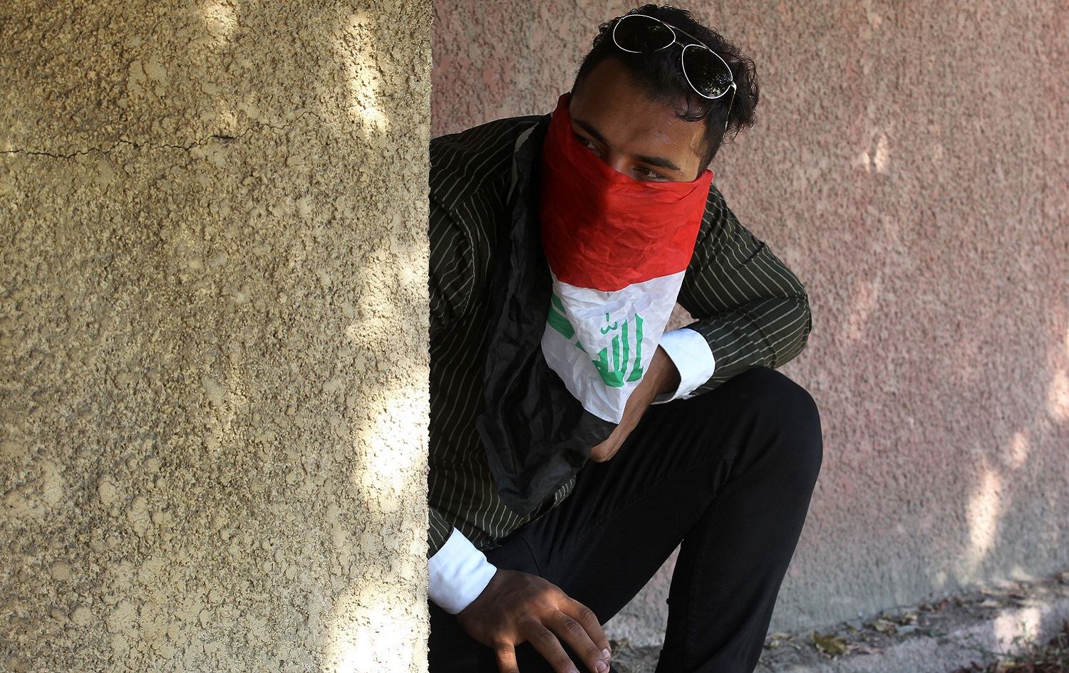 An Iraqi protester hides behind a wall during a demonstration in the Iraqi Baghdad, October 4, 2019. Photo: Ahmad al-Rubaye / AFP