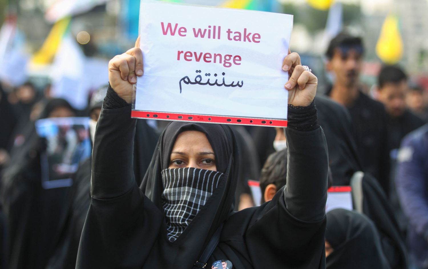 An Iraqi woman holds a placard during the funeral of Iranian military commander Qasem Soleimani, Iraqi paramilitary chief Abu Mahdi al-Muhandis and eight others in Baghdad's district of al-Jadriya, in Baghdad's high-security Green Zone, on January 4, 2020. Photo: AFP / Ahmad al-Rubaye