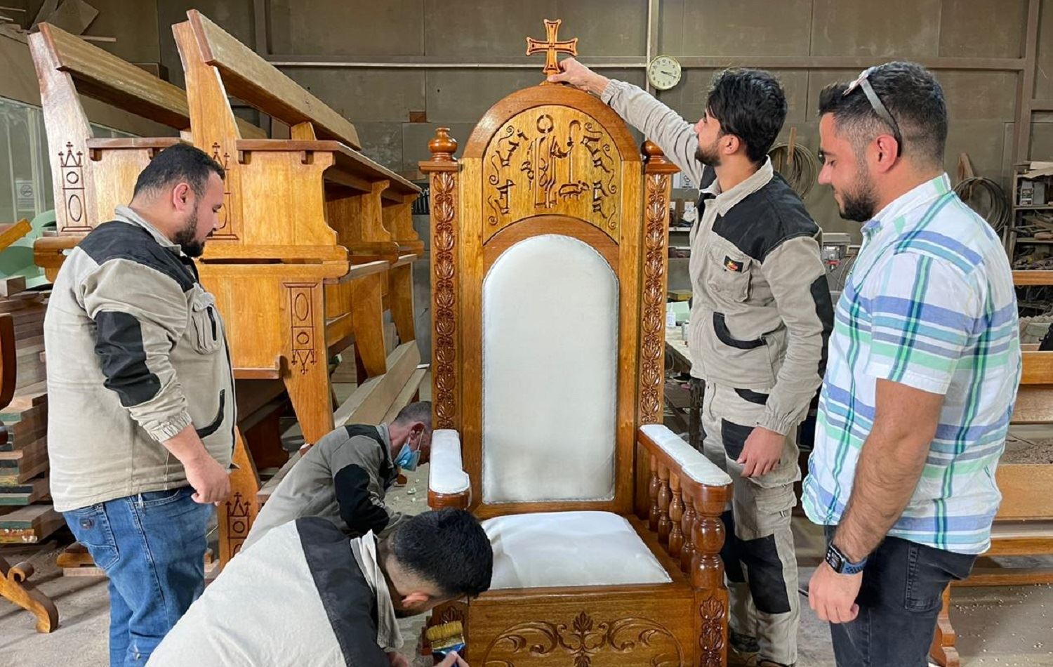 Craftsmen put the finishing touches to a chair made for the pope’s Qaraqosh visit. Photo submitted to Rudaw English by Ninwaya Polis on March 1, 2021.