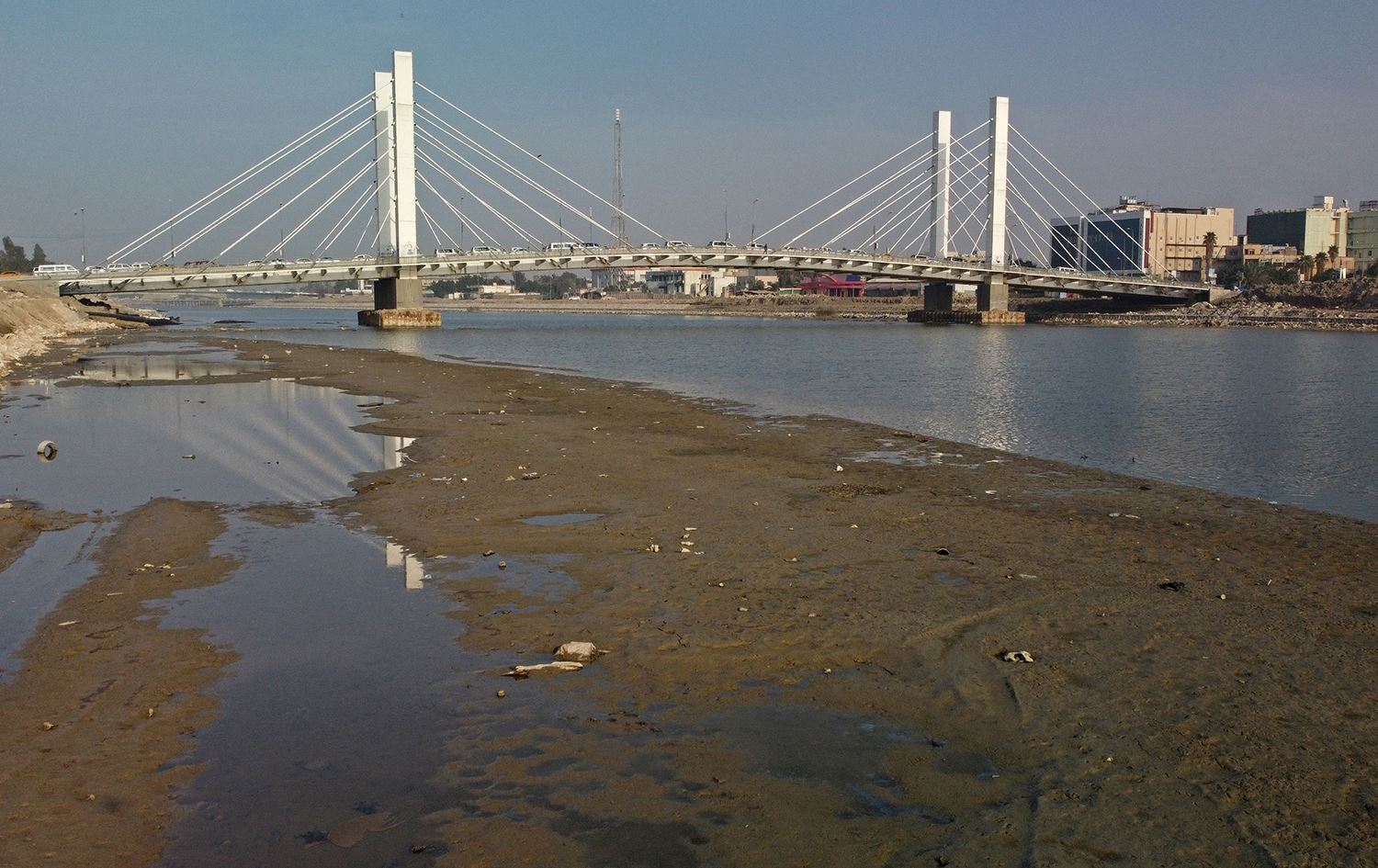 An aerial view shows the Hadarat bridge across the Euphrates river that is witnessing a sharp decrease in water levels, in Nasiriyah on February 26, 2023. Photo: Asaad Niazi/AFP