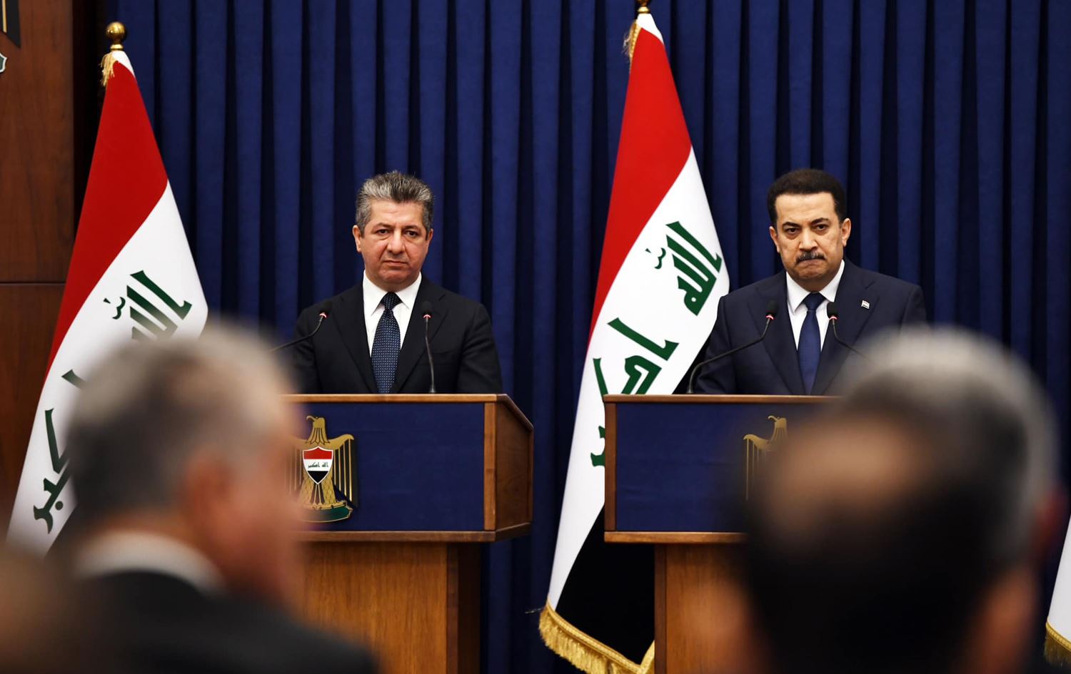 Kurdistan Region Prime Minister Masrour Barzani and Iraqi Prime Minister Mohammed Shia’ al-Sudani during a joint press conference in Baghdad on April 4, 2023. Photo: PM Barzani's office