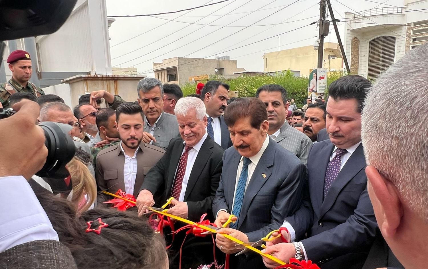 Kurdistan Democratic Party (KDP) officials including politburo secretary Fazel Mirani (center) and Shakhawan Abdullah, second deputy speaker of the Iraqi parliament (right) opening the party's Kirkuk office on April 5, 2025. Photo: Hardi Mohammed/Rudaw